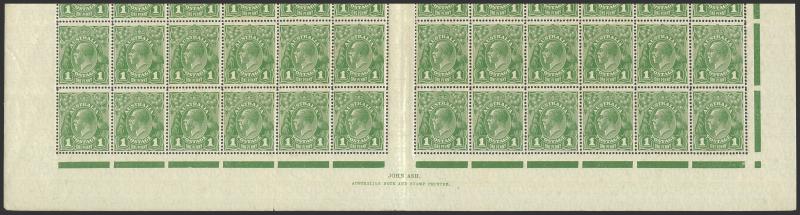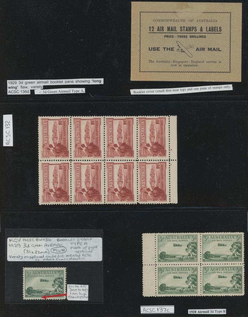 Canberra booklet pane of 8 ** punctured 'OS' block of 4 */**, 1929 Airmail 3d booklet panes */** Type B & Type A with lower-left unit Long Wing to Plane ** (short corner perf) plus booklet cover (minor surface fault) and Type B punctured 'OS' John
