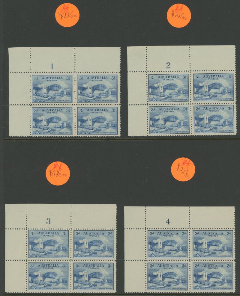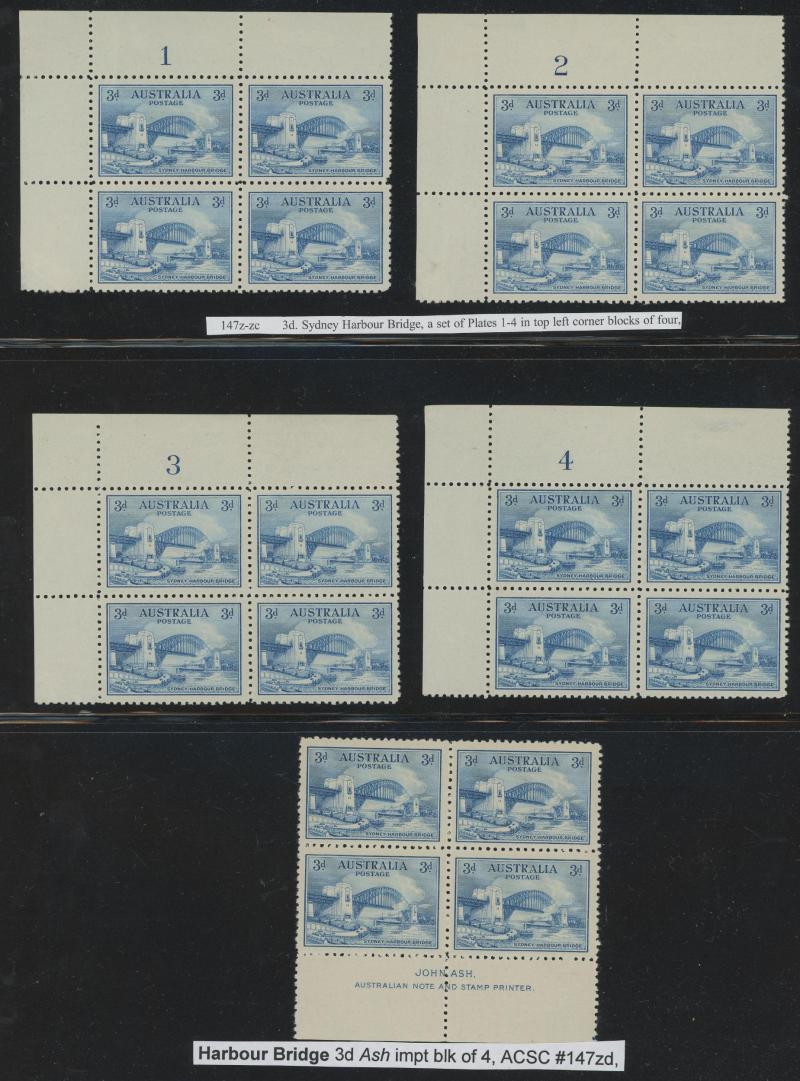 Plate 1-8, 3d Plate 1-3 blocks of 4 and John Ash Imprint blocks including 6d with Re-Entry plus 6d Extra Islands in block of 4 and block of 9 (3x3) mostly **, 1932 Bridge 3d Plate 1-4 blocks of 4 ** and 2d 'OS' overprint John Ash Imprint block of 4 &