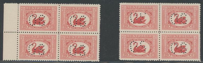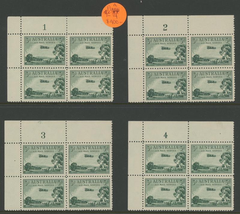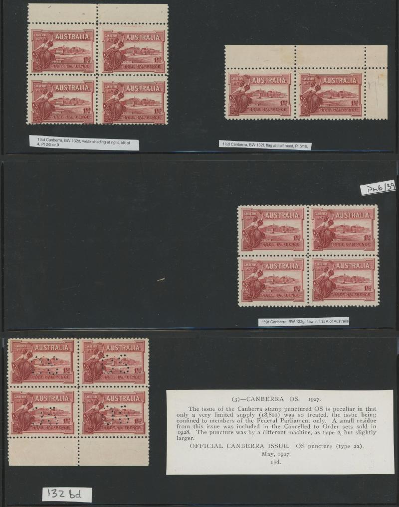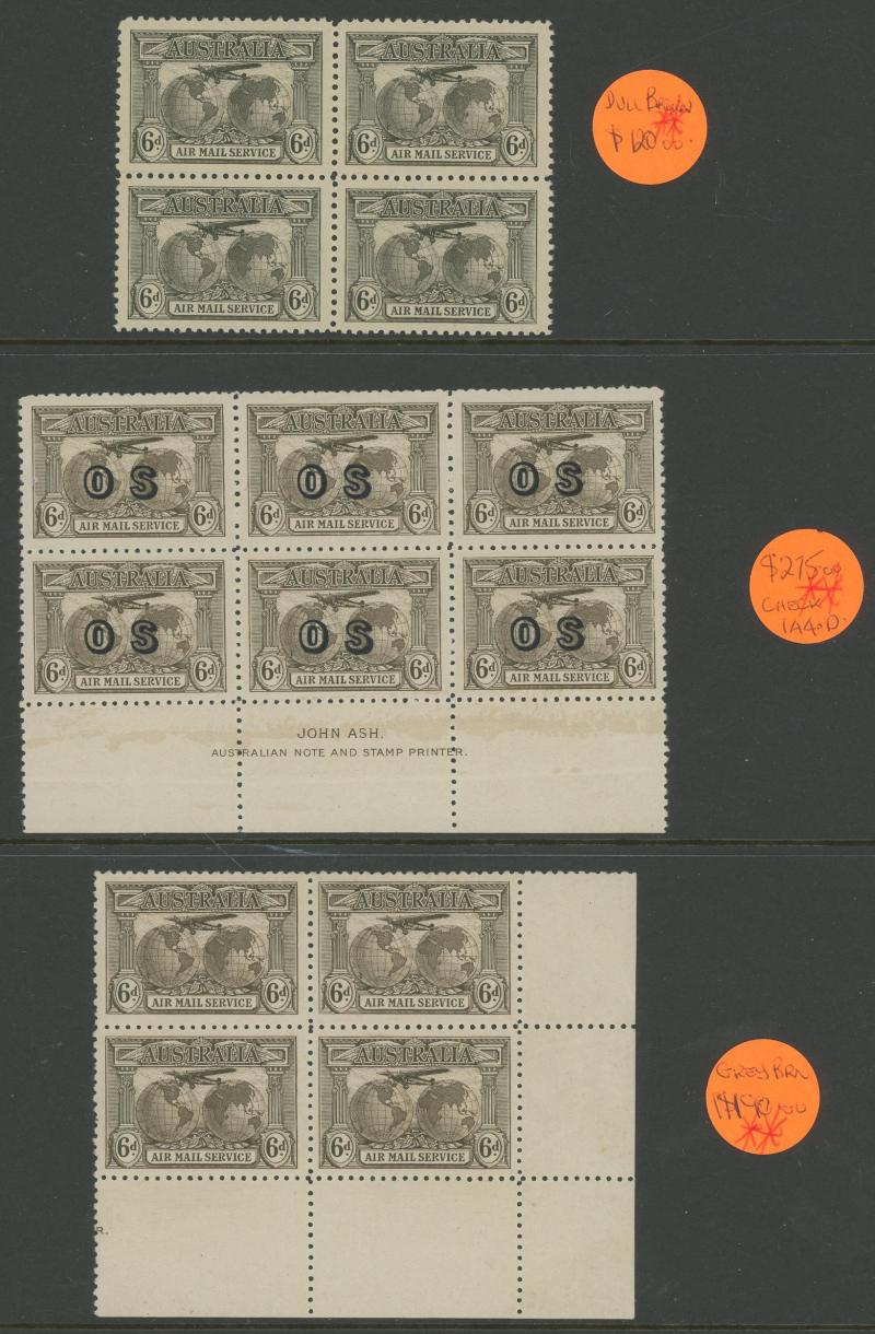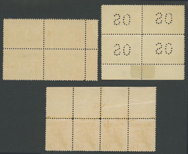 1927-40 blocks of 4 or larger comprising punctured 'OS' Canberra and Swan x 2 not expertised, 1938 3d Airmail Type A Plate Numbers