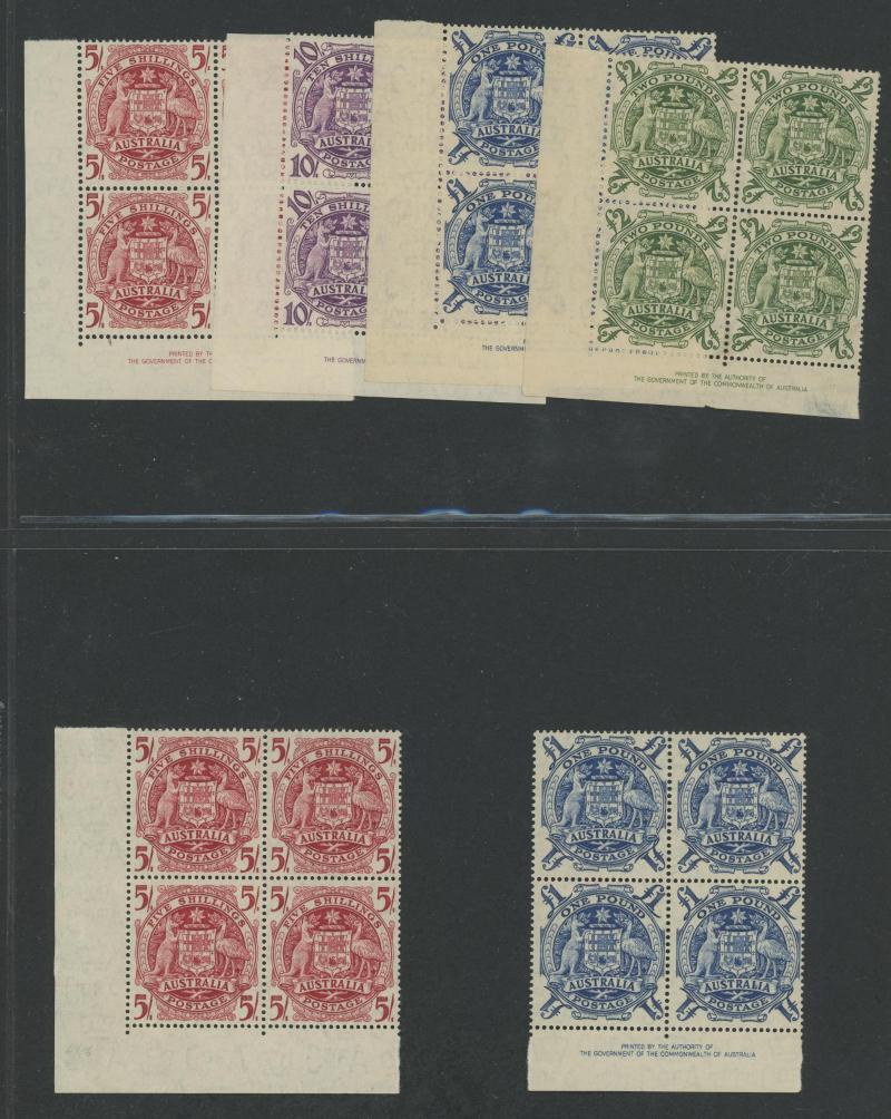 Perf 11½ 1/-, ANZAC 1/- Plate '1', Jubilee 2/- Plate '1' upper-left & upper-right and imprint, KGVI 3d blue Die I imprint block of 8, 2d mauve Medallion Flaw in block of 16 (8x2), Robes Thin Paper 10/-, AIF set, Arms set of imprint blocks plus £1