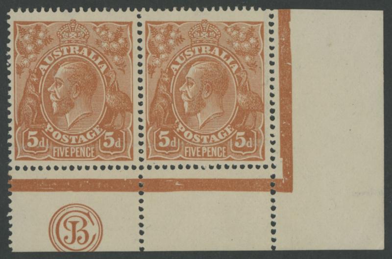 5d chestnut Smooth Paper Comb Perf SG 23b 'JBC' Monogram marginal pair from the lower-right corner of the sheet, the left-hand
