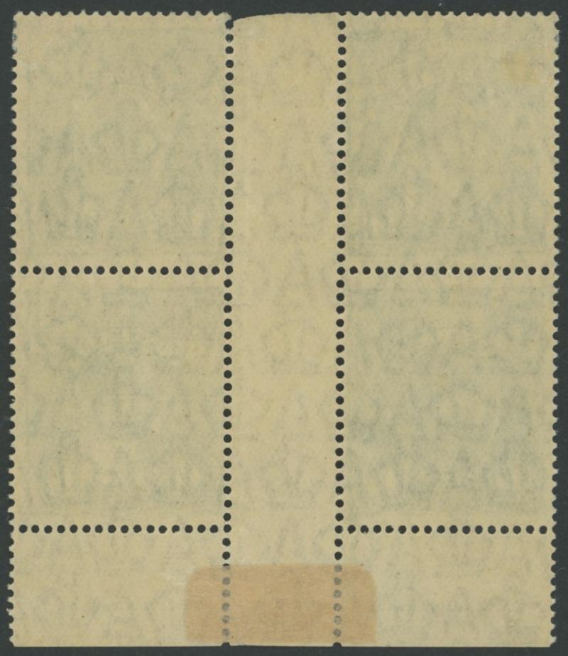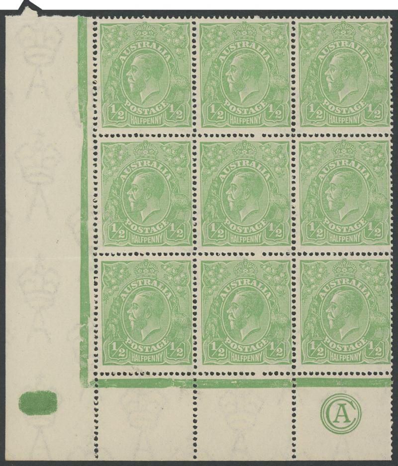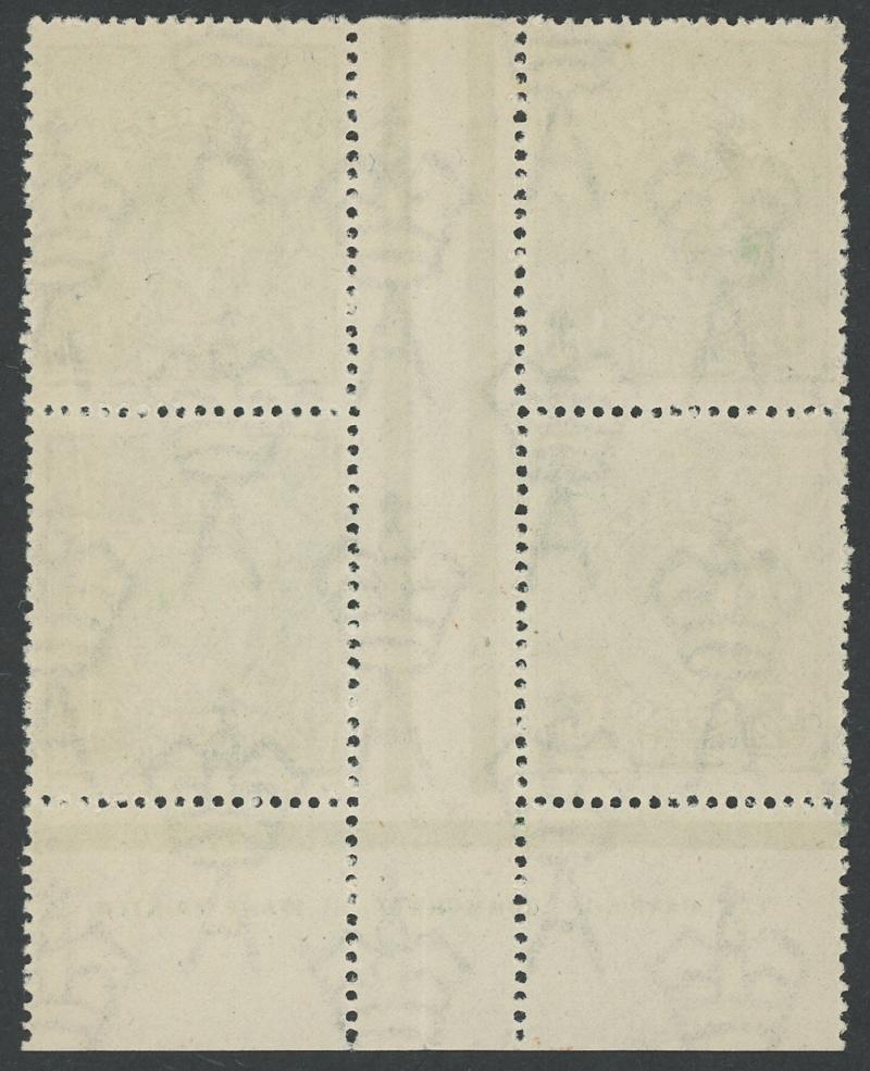 ½d green SG 48 Electro 5 'CA' Monogram strip of 3 ACSC 65(5)z from the lower-left corner of the sheet in a block of 9 (3x3), the