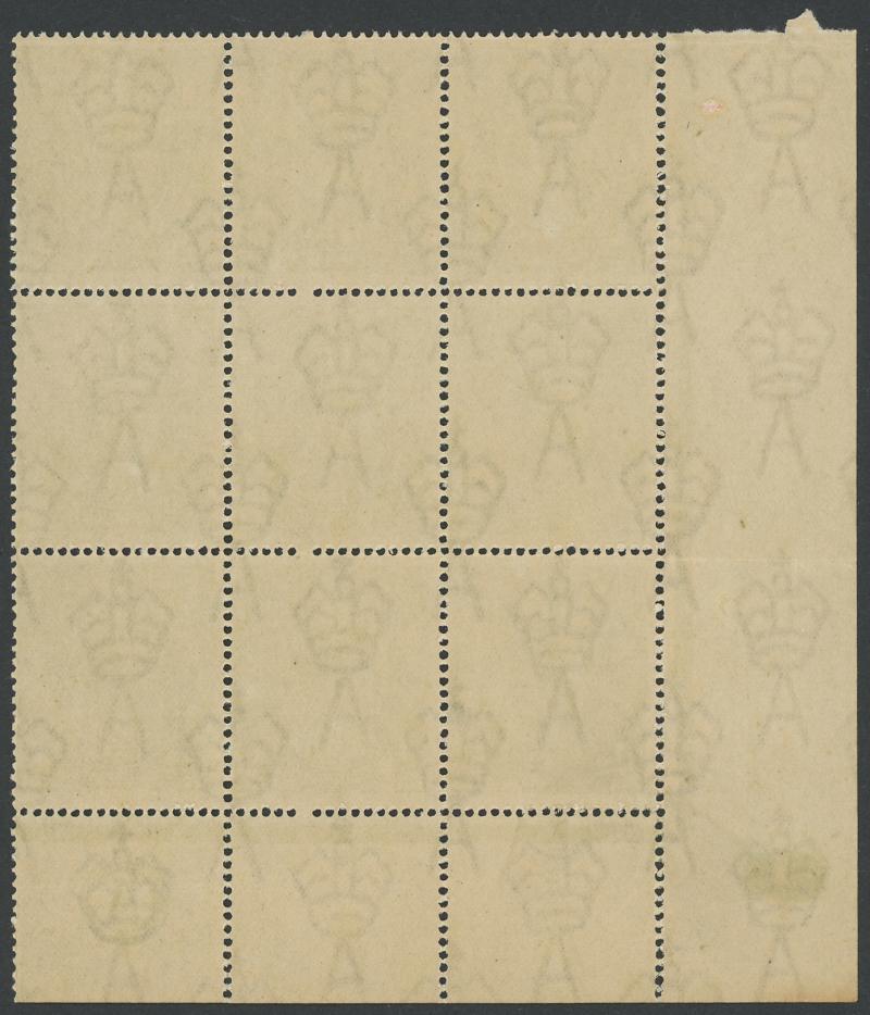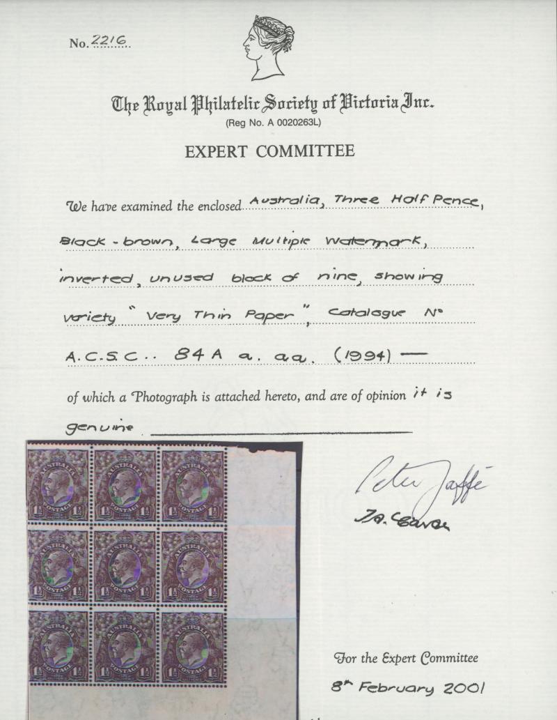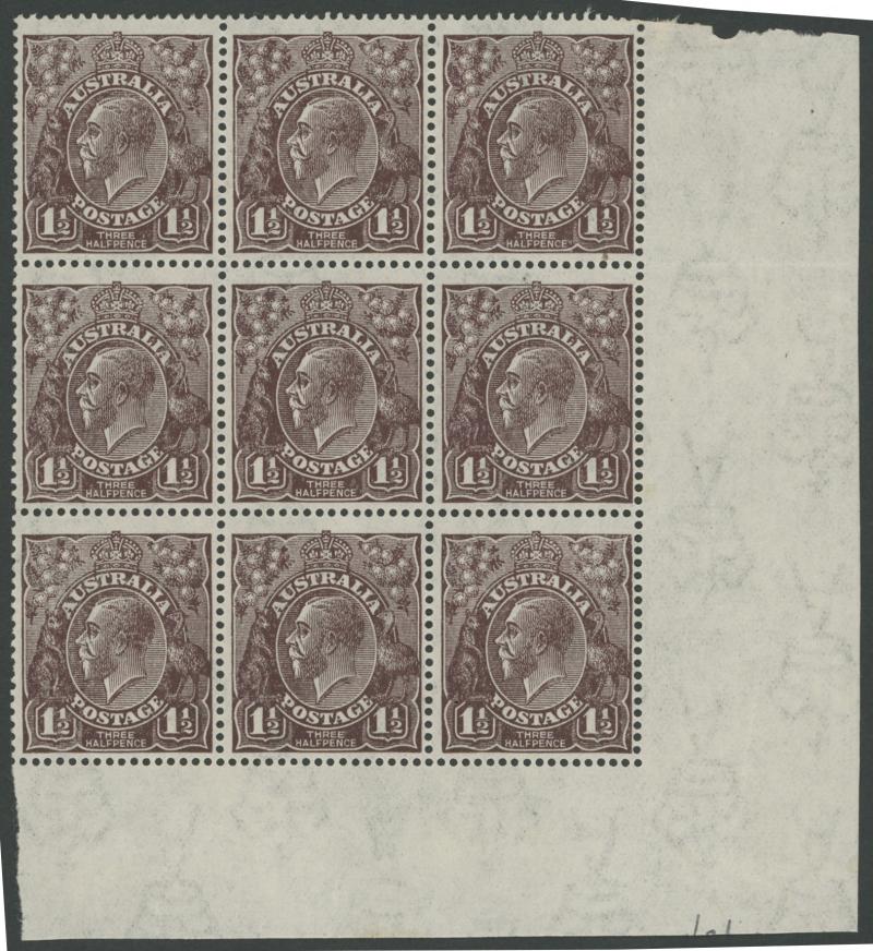 1½d black-brown Very Thin Paper ACSC 84aa (SG 51b) with the Watermark Inverted ACSC 84a (SG 51a) marginal block of 9 (3x3) from the