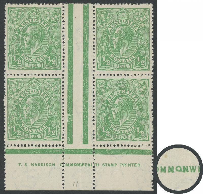 ½d green SG 48 Electro 7 TS Harrison 'COMMQNWEALTH' One-Line Imprint block of 4 ACSC 65(7)z, well-centred especially so for an