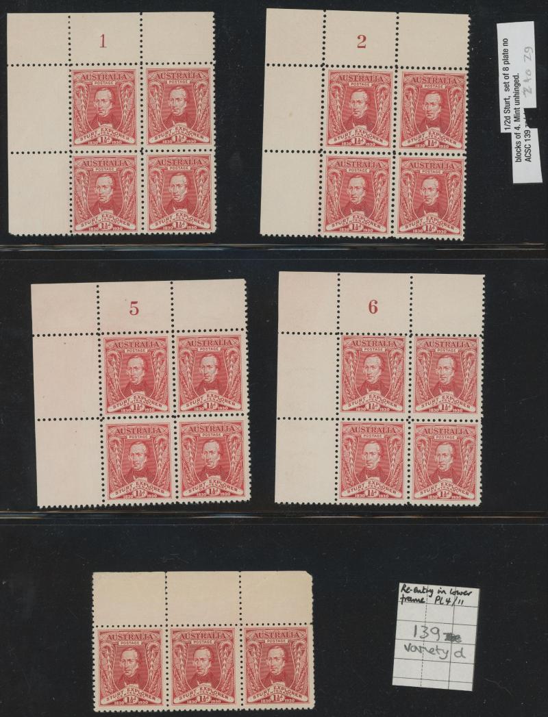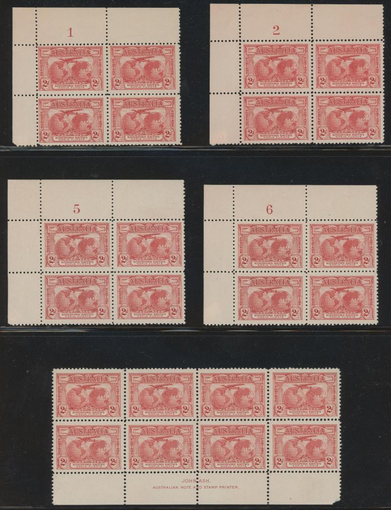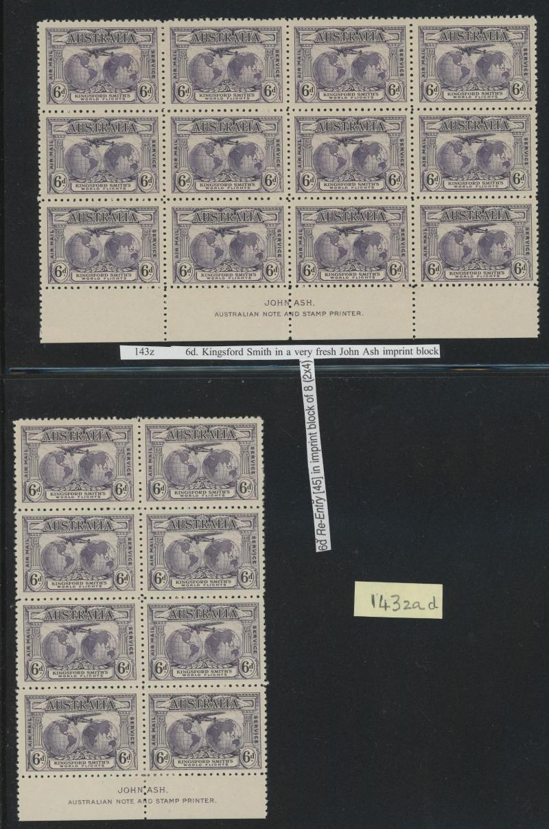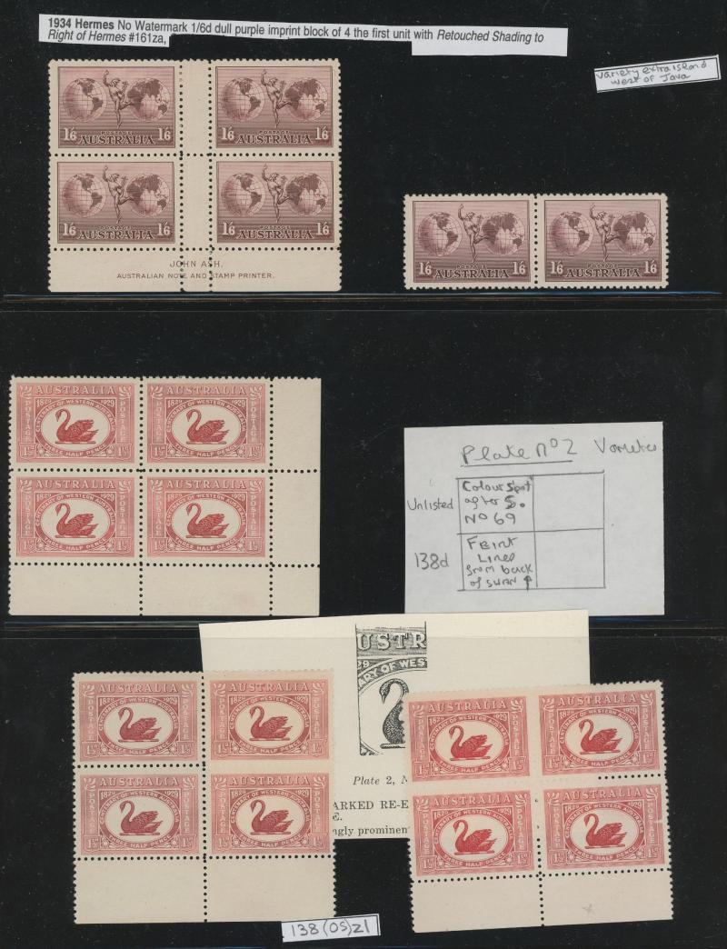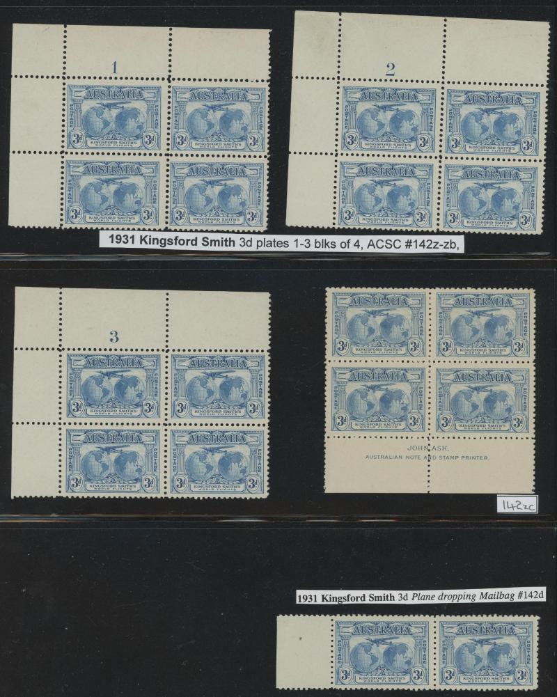 Ash Imprint block of 4 */**, 1929 WA Centenary 1½d Swan complete sheet ** with John Ash Imprint as well as multiple Plate 2 Re-Entry & Roller Flaw varieties **, 1930 Sturt 2d Plate 1-8 and 3d Plate 1 & 2 blocks of 4 mostly **, 1931 Kingsford Smith 2d