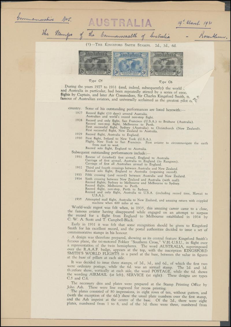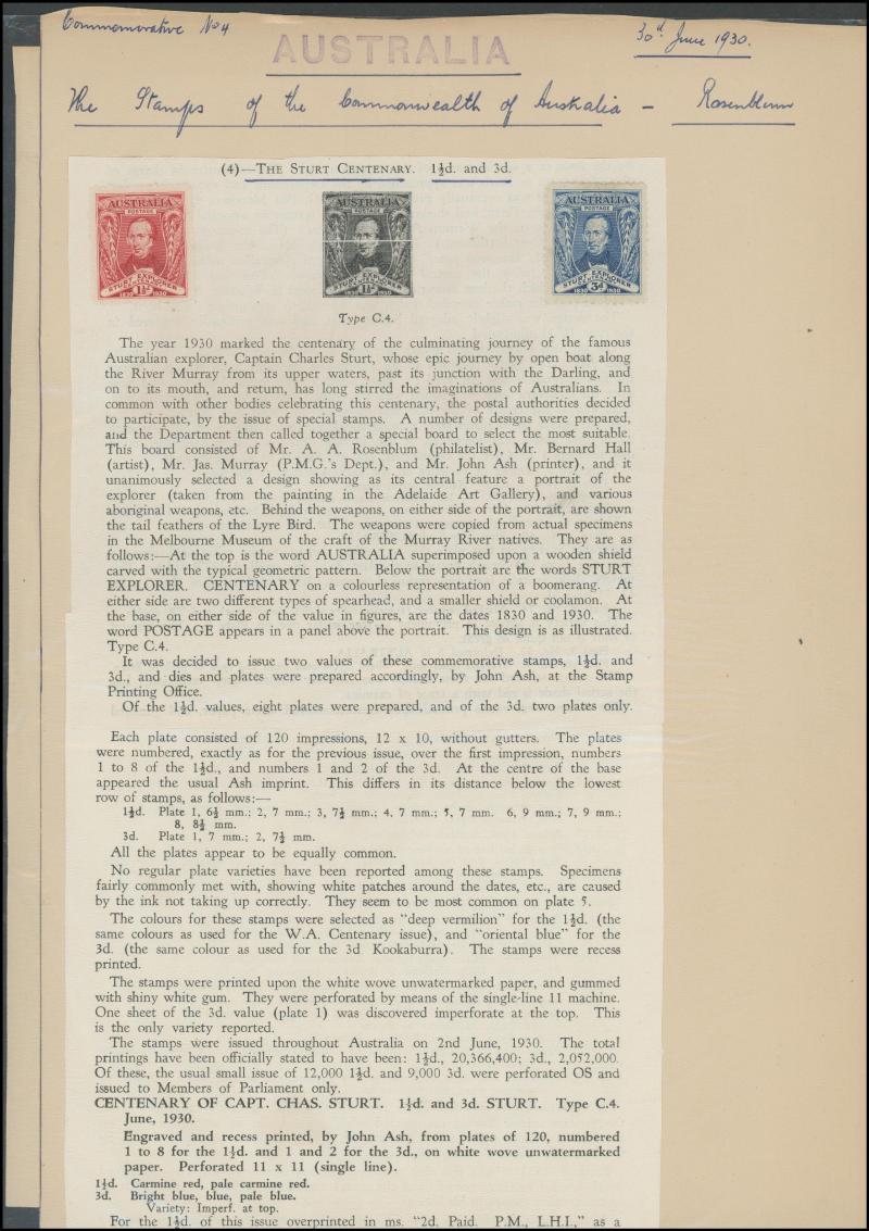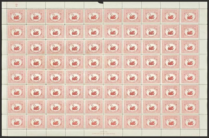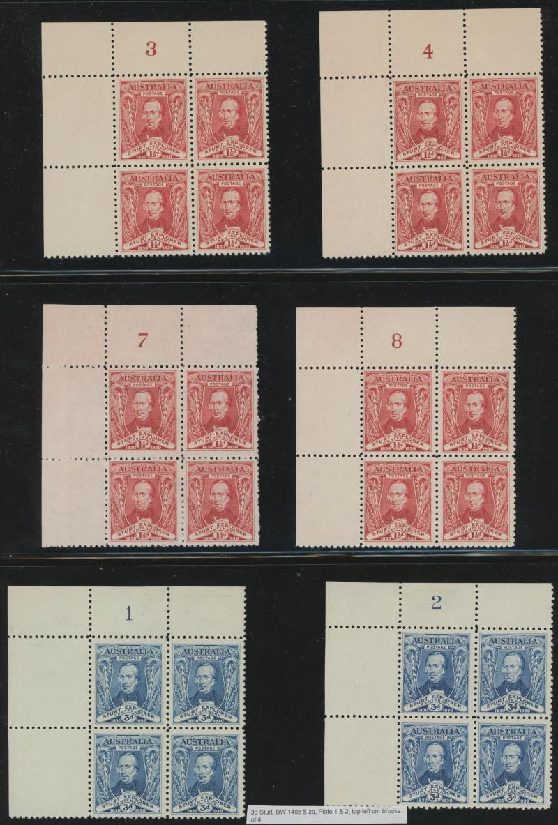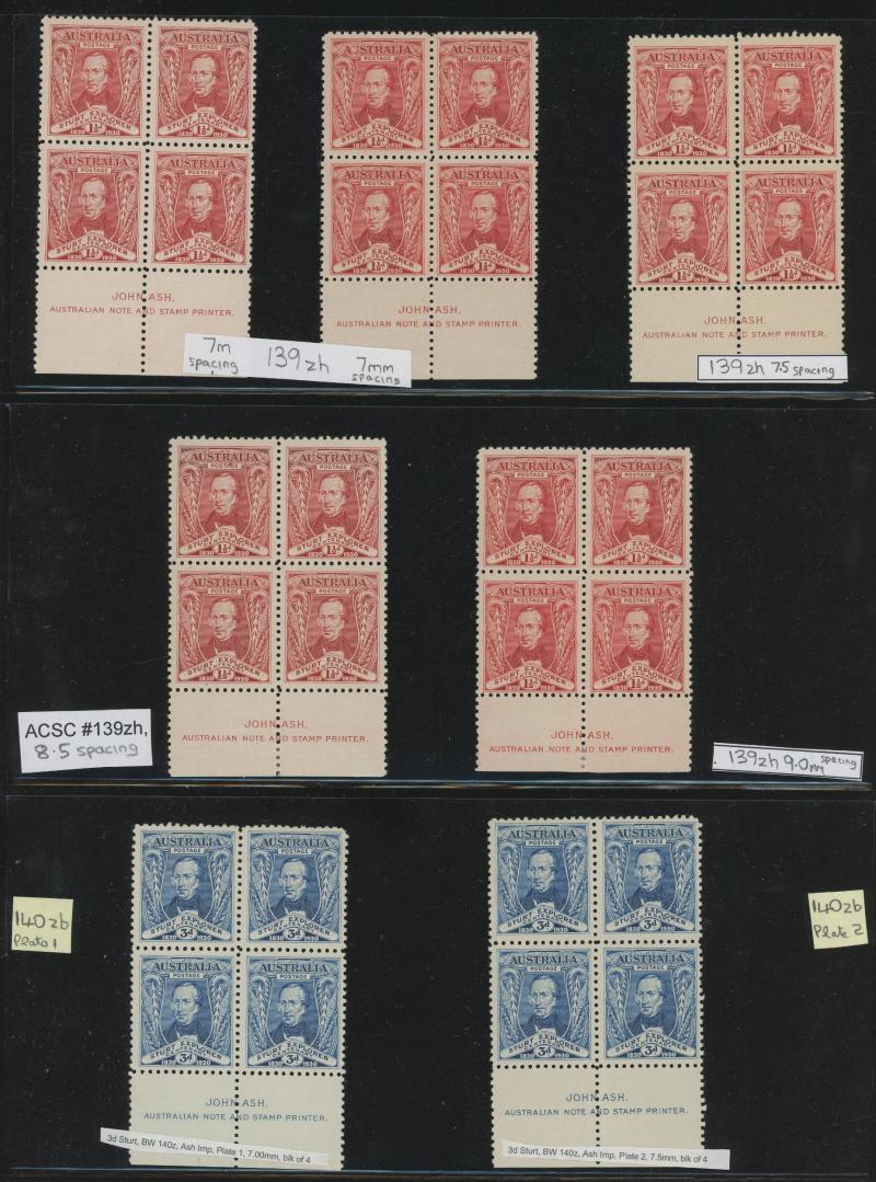 Ash Imprint block of 4 */**, 1929 WA Centenary 1½d Swan complete sheet ** with John Ash Imprint as well as multiple Plate 2 Re-Entry & Roller Flaw varieties **, 1930 Sturt 2d Plate 1-8 and 3d Plate 1 & 2 blocks of 4 mostly **, 1931 Kingsford Smith 2d