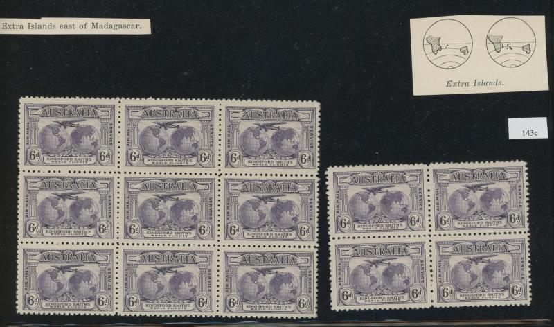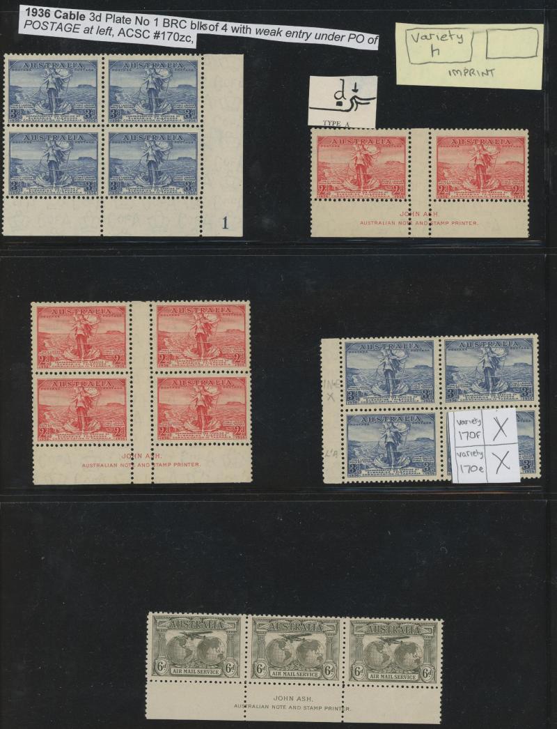block of 4 */** with Retouched Shading and horizontal pair the left-hand unit with Extra Island West of Java *, 1936 Cable 3d Plate Number '1' block of 4 ** with Weak Entry, and 1936 SA Centenary John Ash Imprint blocks of 4 */**, various other