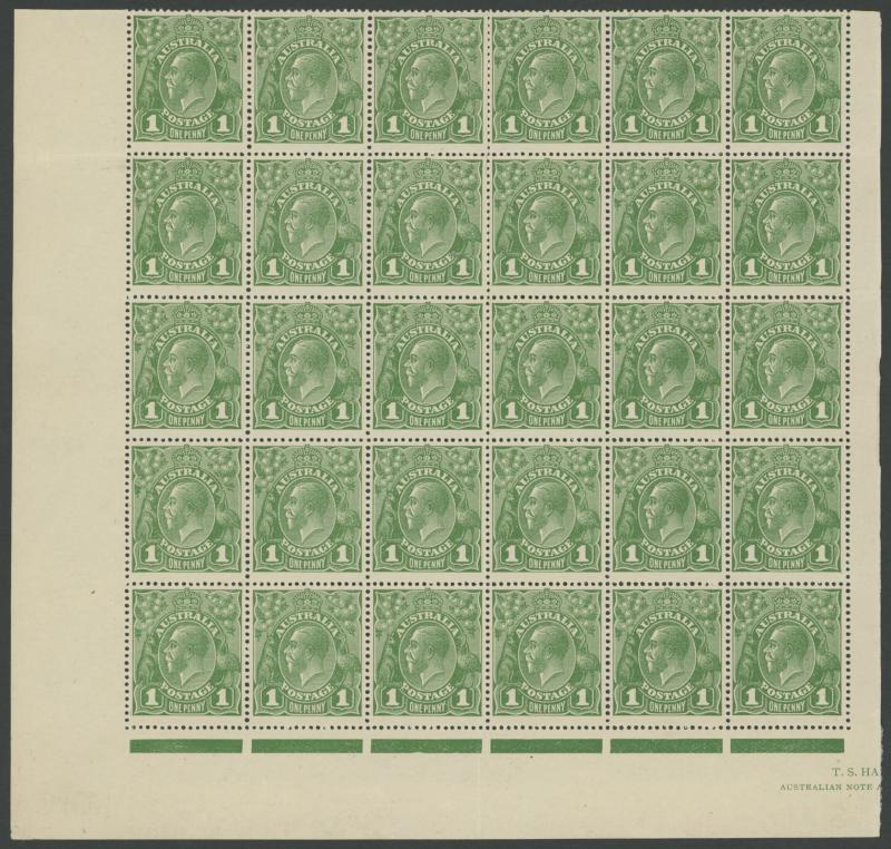 1d green ACSC 82(OS) (SG O129) Plate 4 complete sheet of 120 (missing the lower-left unit) with listed varieties & John Ash