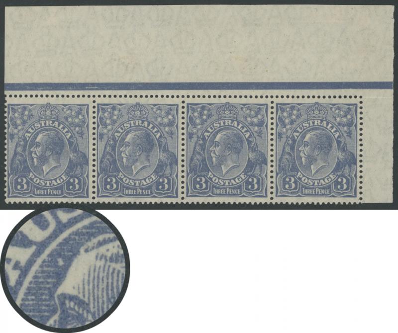 3d blue Mullett Plates Die Ia SG 90 strip of four from the upper-right corner of the sheet, the left-hand unit Type A with White