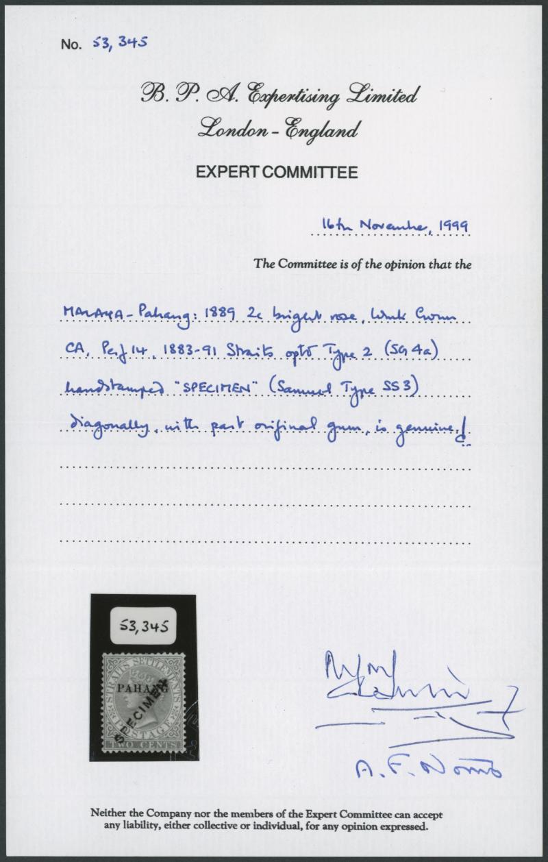 1889 Overprints on Straits Settlements QV 2c rose 'PAHANG' Type 2 overprint SG 4a handstamped 'SPECIMEN' Samuel Type SS3,