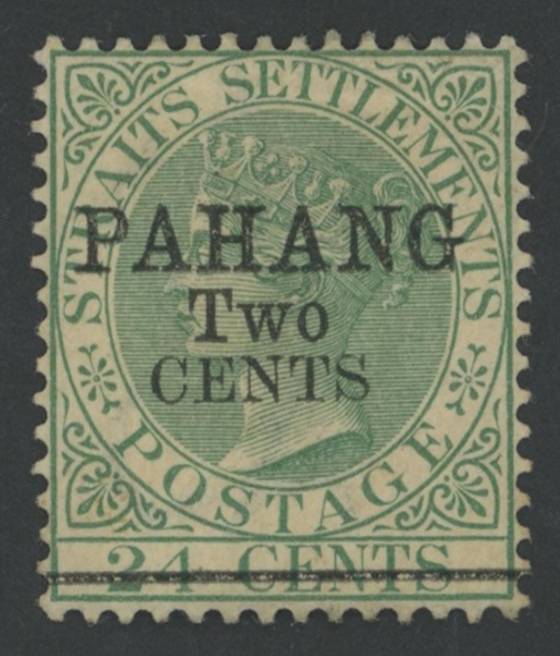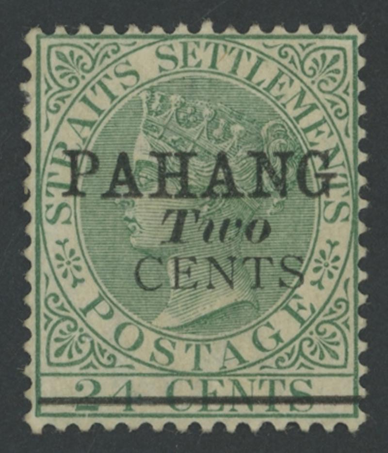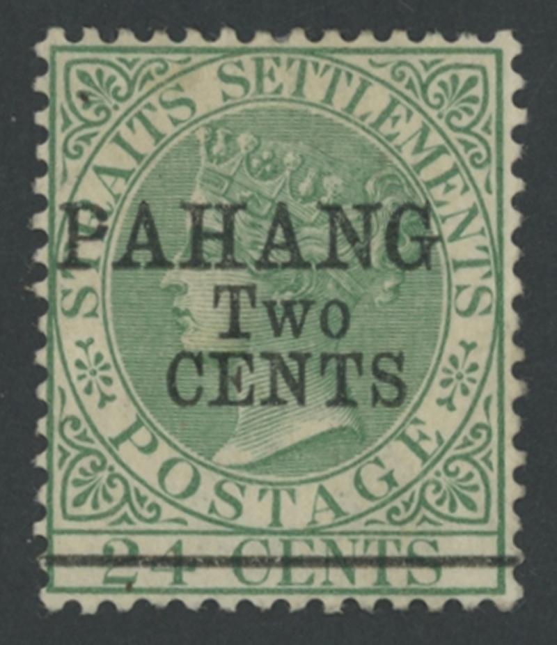 1891 Surcharges on Straits Settlements QV 24c green 'PAHANG/TWO/CENTS' Type 3 overprint SG 9, fresh colour, well-centred,
