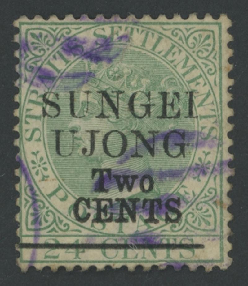 1891 Surcharges on Straits Settlements QV 24c green 'SUNGEI/UJONG/Two/CENTS' Type 32 overprint SG 47, light partial bars cancels in