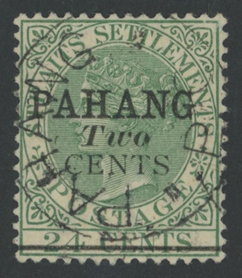 1891 Surcharges on Straits Settlements QV 24c green 'PAHANG/Two/CENTS' Type 7 overprint SG 9, small-part 'PAHA[NG/P.O.]' undated