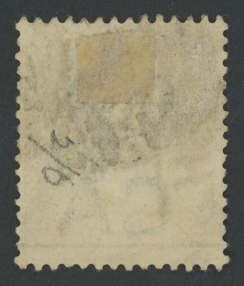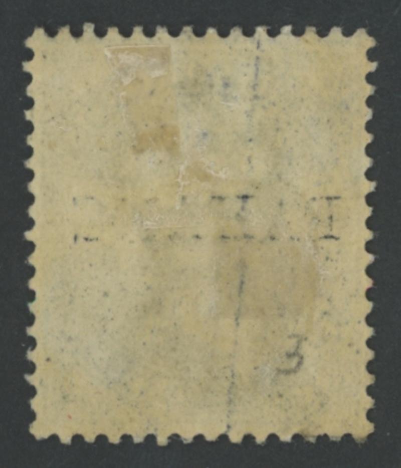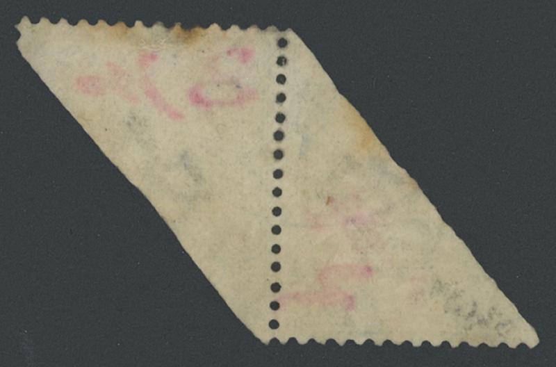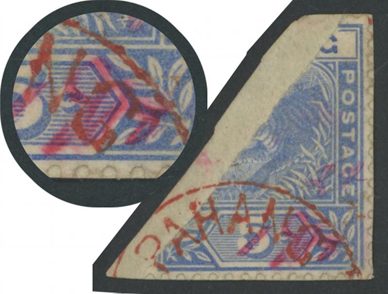 1897 Manuscript Surcharges on Bisected Tiger 5c blue "3" [cents] & "2" [cents] in red on diagonally bisected se-tenant pair SG 18b,