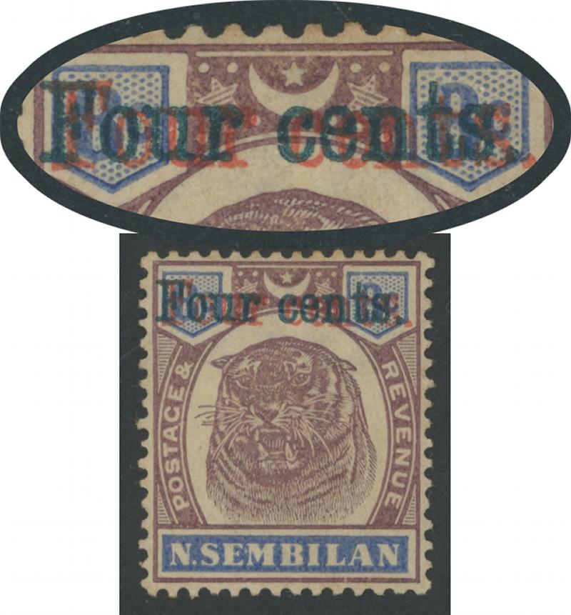 1898-1900 Surcharges on Tigers 'Four cents.' overprint without obliterating bar in green on 8c dull purple & ultramarine with the