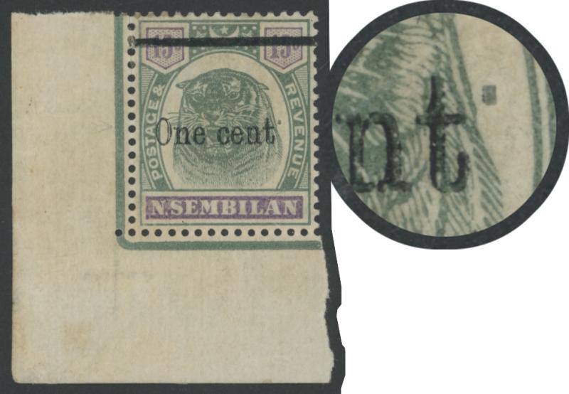 1898-1900 Surcharges on Tigers 'One cent.' overprint with obliterating bar on 15c green & violet with Raised Stop after 'cent' SG