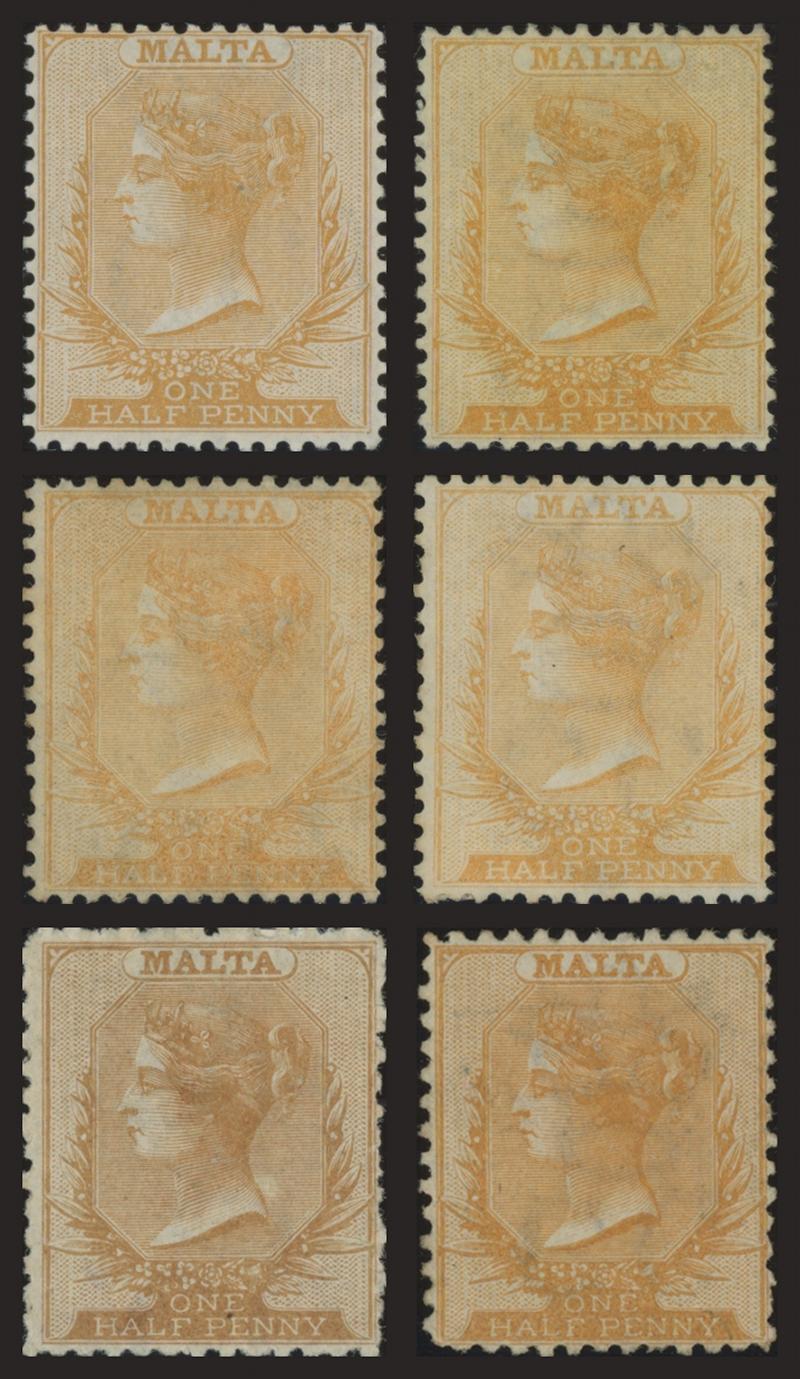No Wmk ½d used, 1863-81 ½d shades buff (used), brown-red, orange-buff, dull orange, golden yellow (aniline), pale buff, yellow-buff, bright orange-yellow, yellow, Perf 12½ buff-brown and orange-yellow shades, Perf 14x12½ yellow-buff x2 (one used),