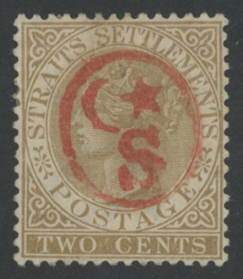 1882 (circa) Handstamps on Straits Settlements QV 2c brown Crown CA Watermark with '[Crescent & Star]/ S ' handstamp in red,