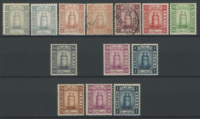 in red) to 4/- and used part-set including 2½d orange, 2/-, 2/6d, 3/- & 4/-, 1932 Settlement set * & punctured 'SPECIMEN', 1938-48 KGVI Pictorials set including all perf varieties */** plus similar used (ex Perf 13 2/6d & 5/-) and £1 block of 4 **,