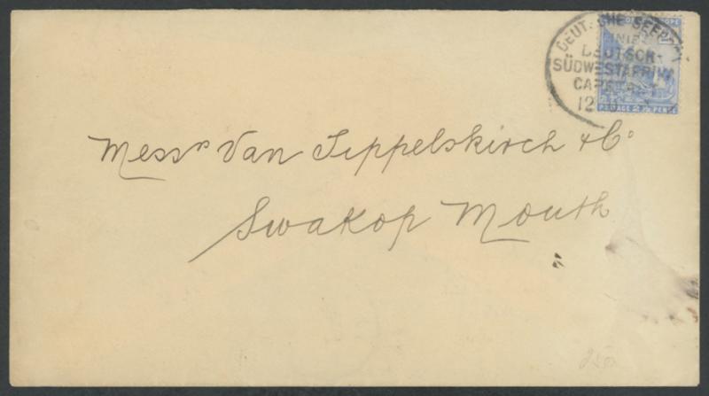 scarce oval 'DEUTSCH SEEPOST/LINIE/SUDWESTAFRIKA/CAPSTADT/12 10 00' datestamp, 'SWAKOPMUND/16 10/00/***' arrival backstamp, minor blemishes.