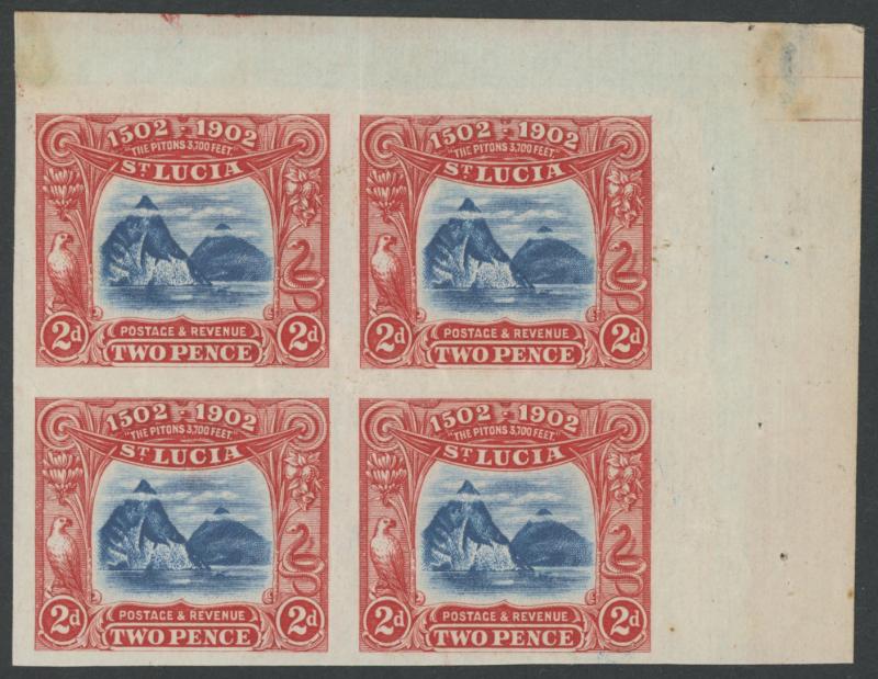 1902 Anniversary of Discovery by Christopher Columbus 2d The Pitons imperforate colour trial in blue & brown-red on unwatermarked