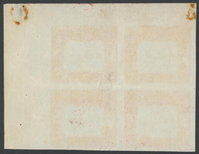 ungummed paper block of 4 from the upper-right corner of the sheet, a few small pin-holes and two adhesion marks in the margins only where removed from the printer's record book. Ex Jerry Blair. This is the corner block from the half-sheet