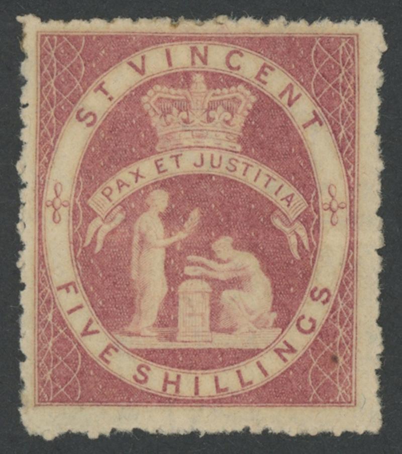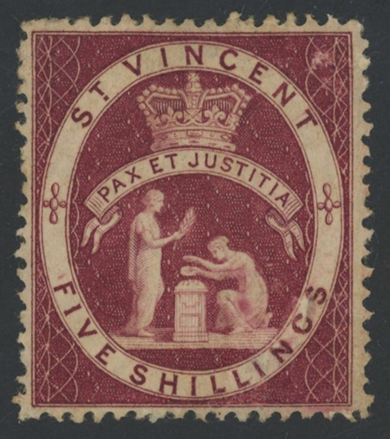 1871-80 QV Small Star Watermark Peace & Justice 5/- deep carmine-lake Perf 11-12½ SG 32 shade variant, extremely well-centred for