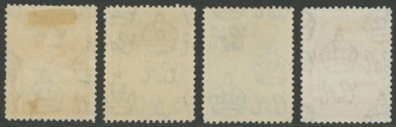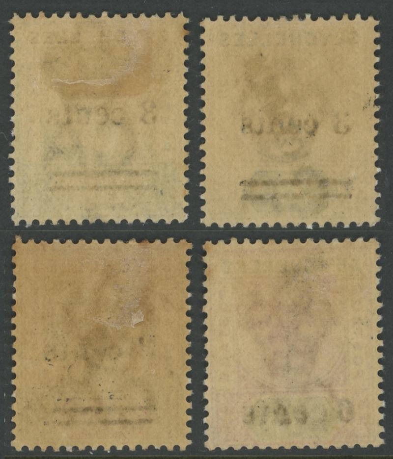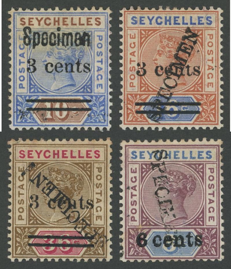 carmine and '6 cents' on 8c purple & ultramarine SG 37-40, the first with 'Specimen' handstamp Samuel Type SY4, the others with 'SPECIMEN' Samuel Type SY3 haphazardly applied one Diagonally Upwards, one Vertically Downwards, and one Diagonally