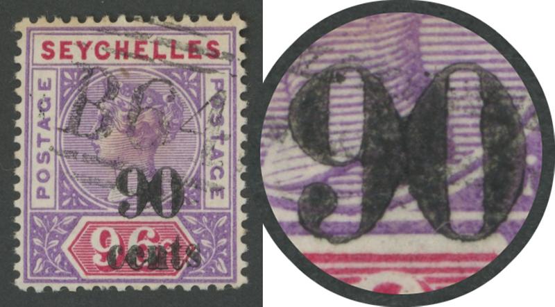 1893 Local Surcharges on QV Keyplates '90/cents' on 96c mauve & carmine with Wide '0' of Surcharge (Joined to '9' of '90') SG 21a,