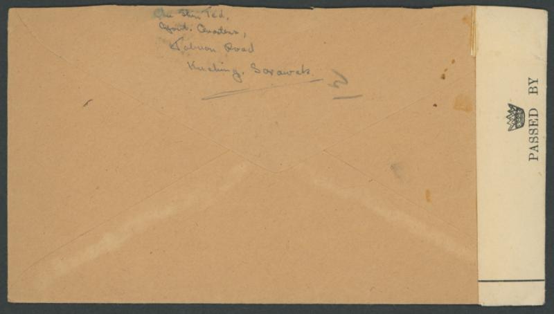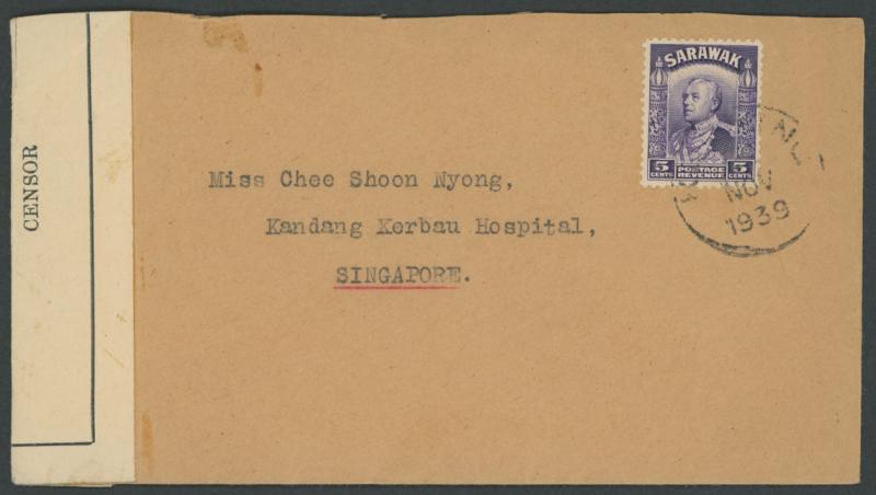 POSTAL HISTORY: 1939 (Nov 2) envelope to Singapore with Vyner Brooke 5c violet solo tied by 'KUCHING' cds, scarce 'PASSED