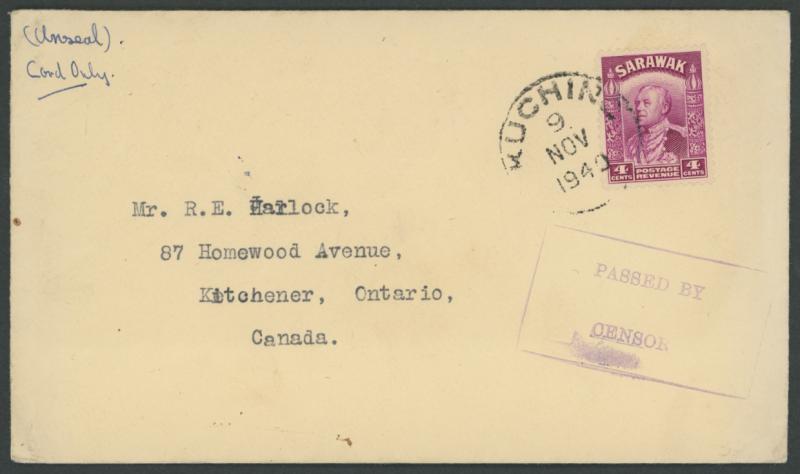 POSTAL HISTORY: 1940 (Nov 9) envelope unsealed to Canada endorsed "Card Only" with Vyner Brooke 4c purple solo tied by 'KUCHING'