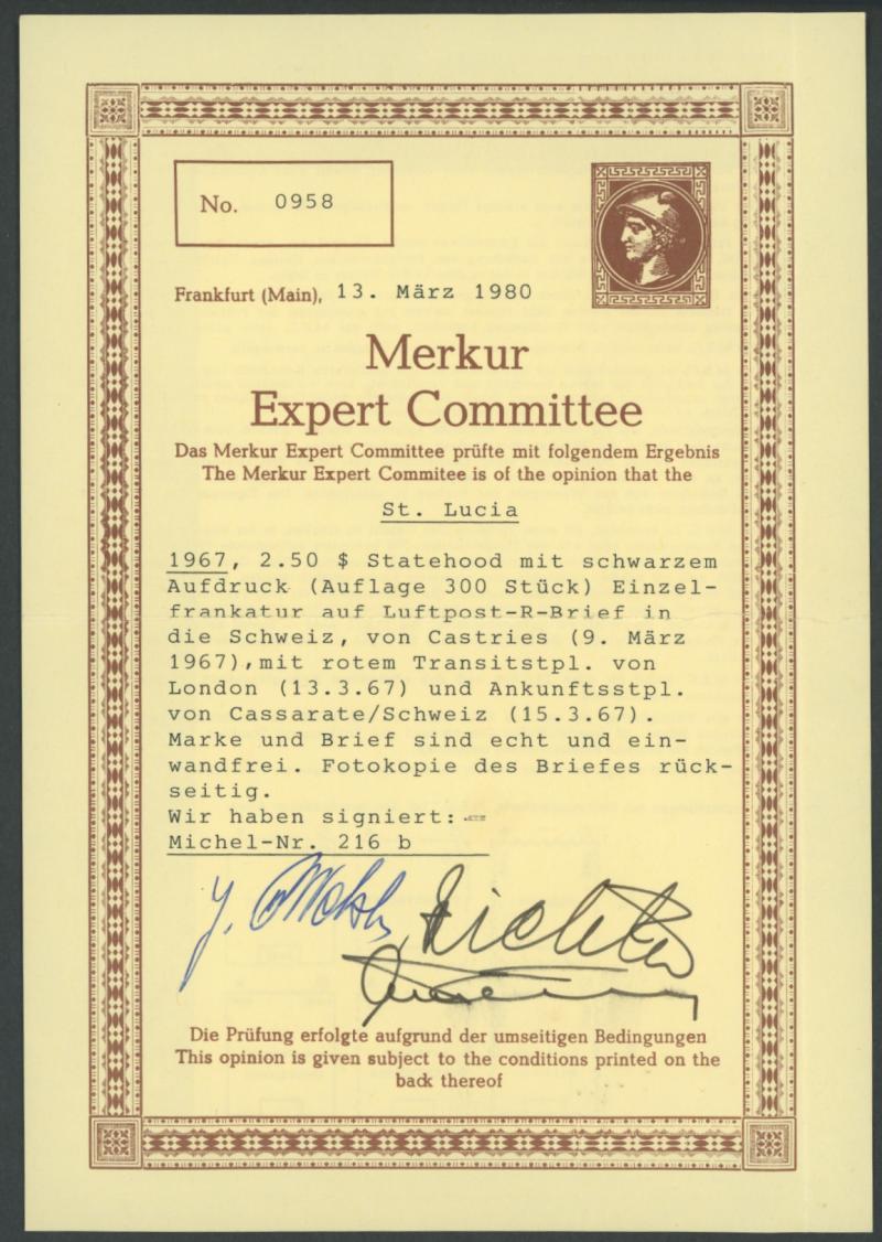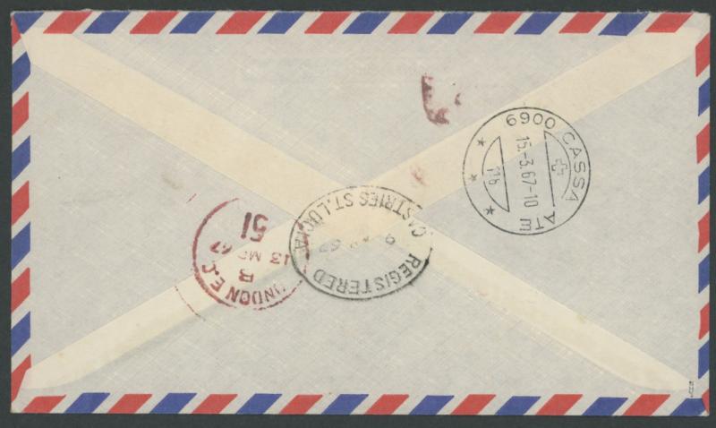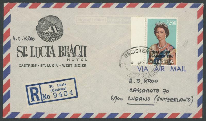 advertising envelope by 'REGISTERED/9 MR 67/CASTRIES, ST LUCIA' oval datestamp, registered airmail to Switzerland with blue R label on the face, London transit and Cassarate arrival backstamps. Unlisted by Gibbons, who state in a footnote that "...