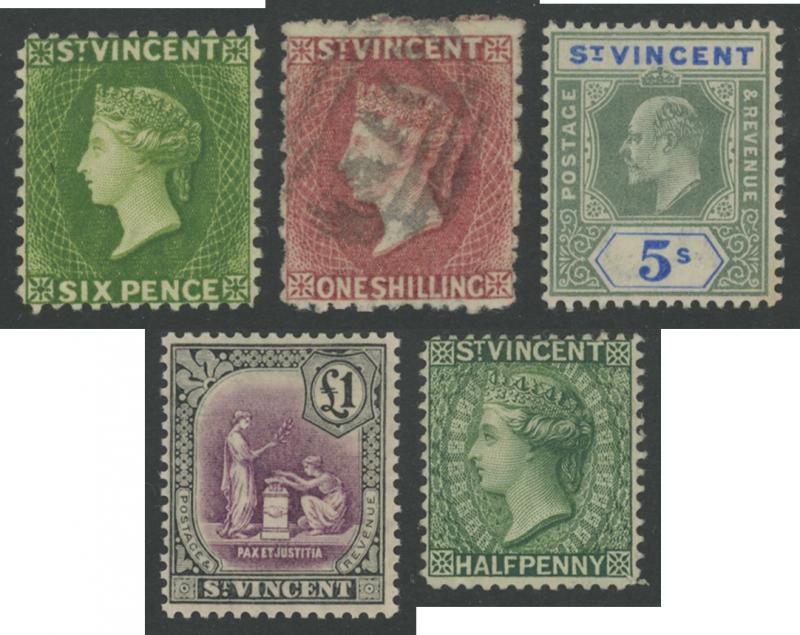 2½d on 1d milky blue * and used, 1893-94 5d on 6d carmine-lake plus pair and vertical strip of three (one unit **), KEVII 1902 Keyplates set, 1907-08 Peace & Justice 2½d, 1915 1d on KGV 1/- used plus pair on piece, 1921-32 Heads to 5/- including 4d