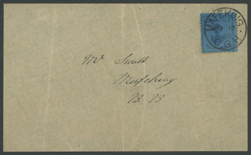 MAFEKING SIEGE: 1900 Colonel Baden-Powell 18½mm Wide 3d deep blue/blue SG 20 tied to envelope addressed to "Mr Smith, Mafeking,