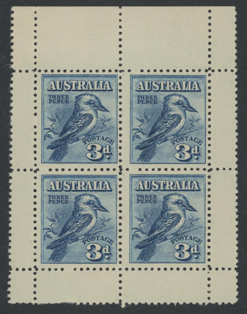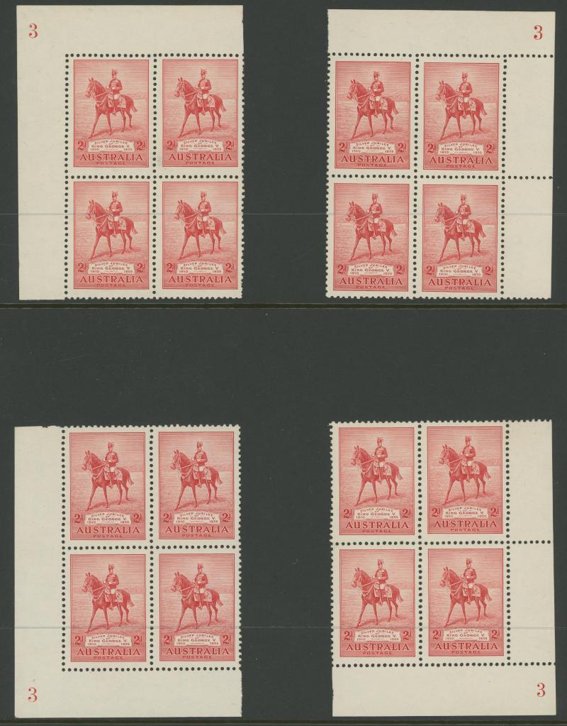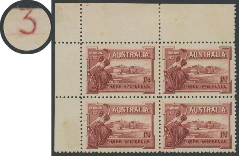 1927 Opening of Federal Parliament House Canberra 1½d upper-left corner block of 4 with large-part (95%) Plate Number '3' ACSC