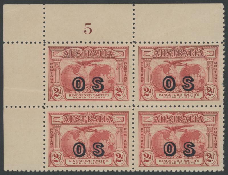 1931 Kingsford Smith 2d red overprinted 'OS' SG O123 upper-left corner block of 4 with Plate Number '5' ACSC 141(OS)zd, natural