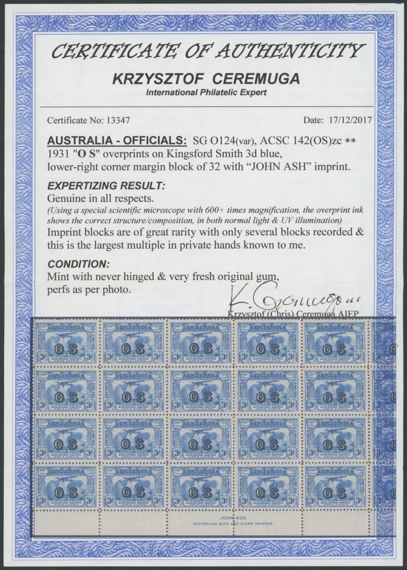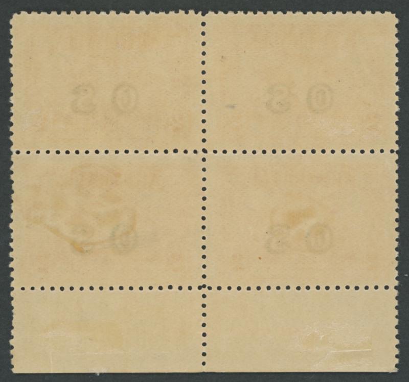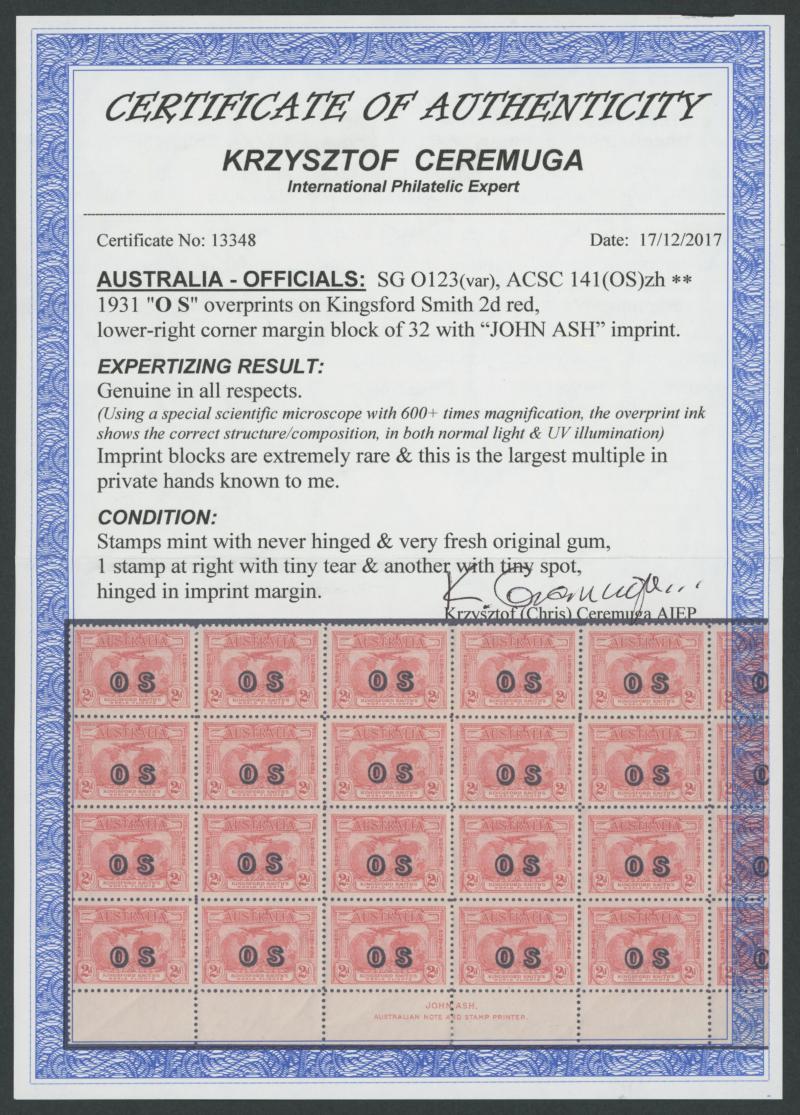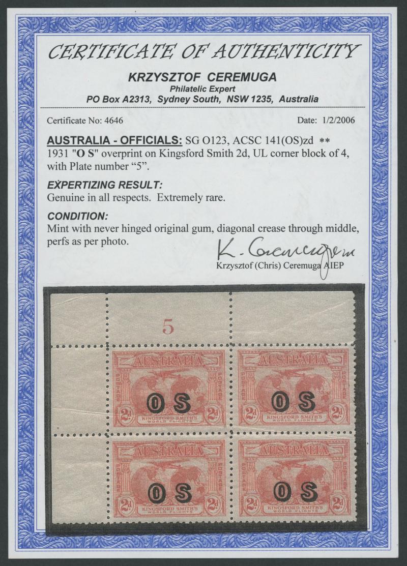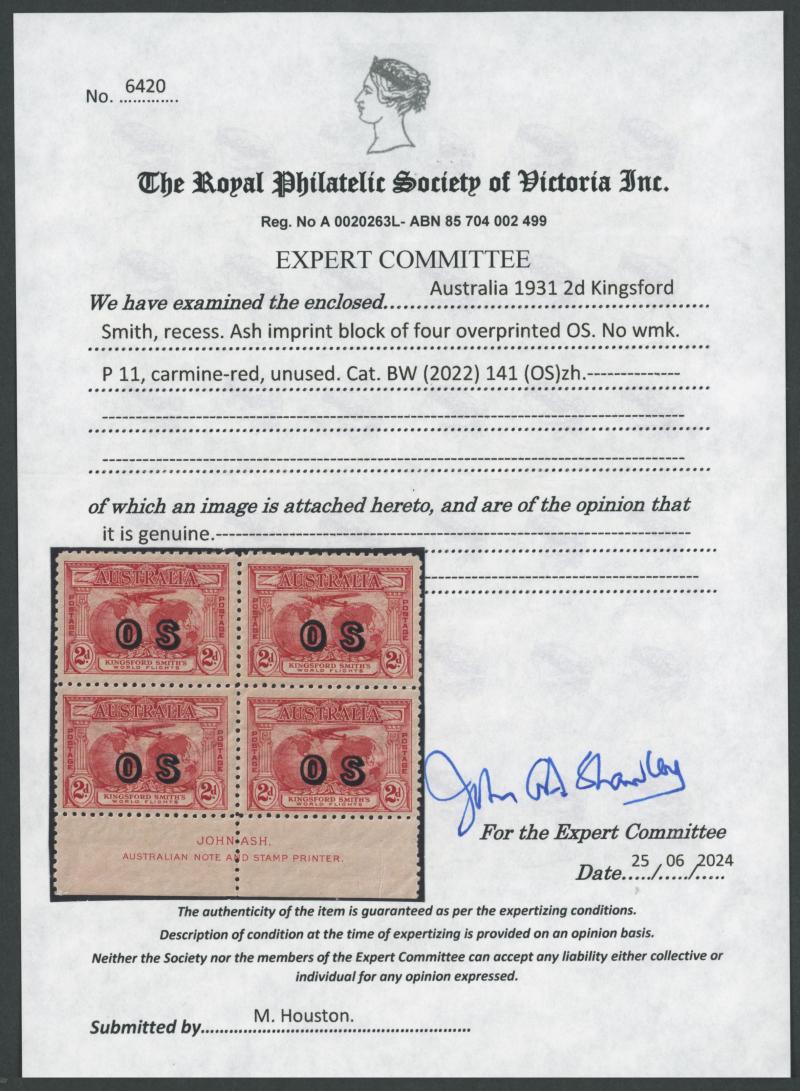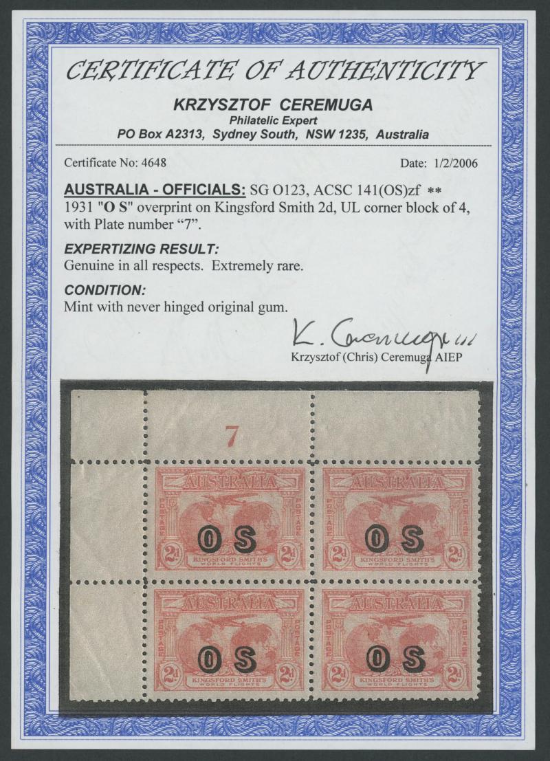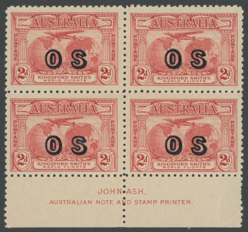 1931 Kingsford Smith 2d red overprinted 'OS' SG O123 John Ash Imprint block of 4 ACSC 141(OS)zh, Cat $3750. RPSV Certificate