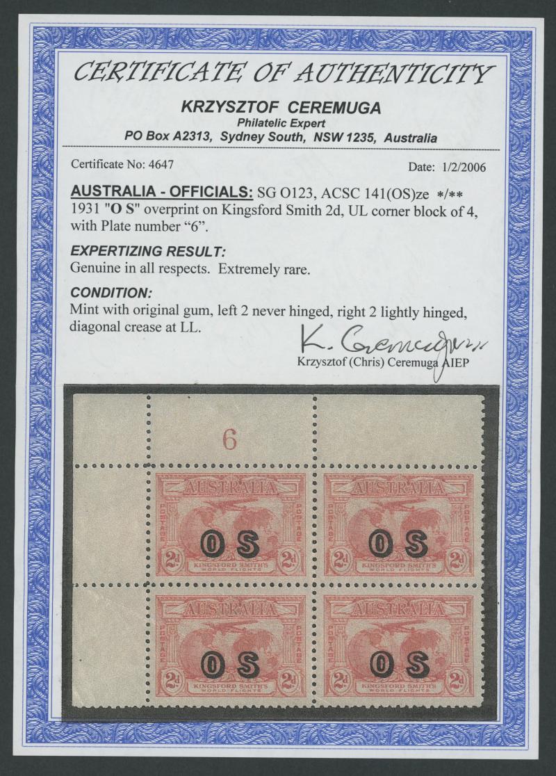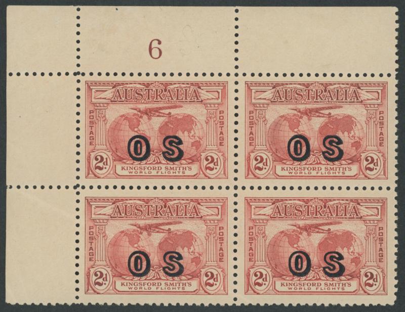 1931 Kingsford Smith 2d red overprinted 'OS' SG O123 upper-left corner block of 4 with Plate Number '6' ACSC 141(OS)ze, natural gum