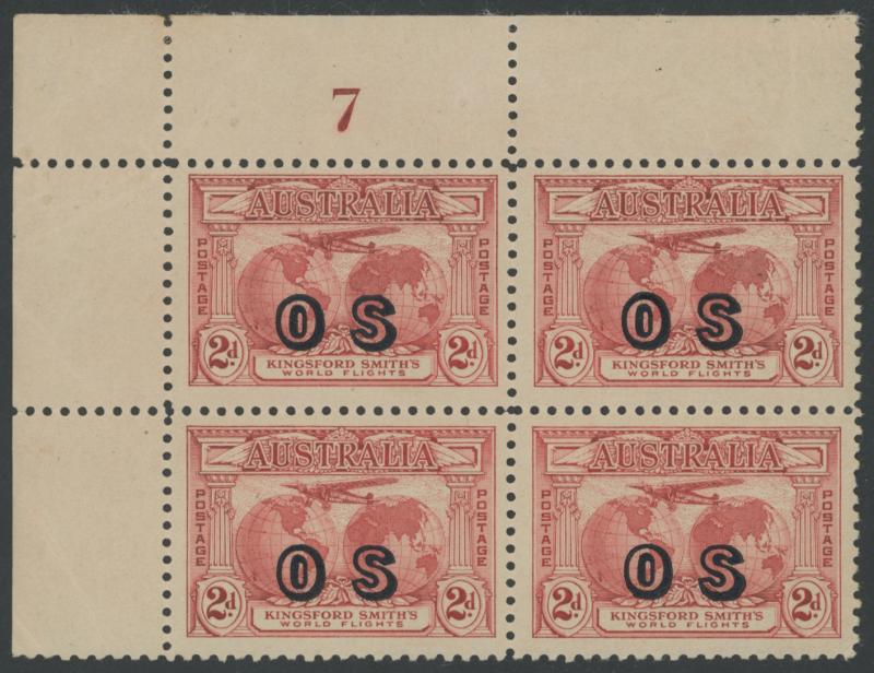1931 Kingsford Smith 2d red overprinted 'OS' SG O123 upper-left corner block of 4 with Plate Number '7' ACSC 141(OS)zf, unmounted,