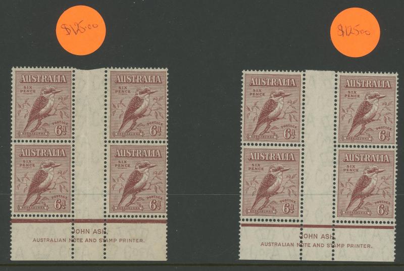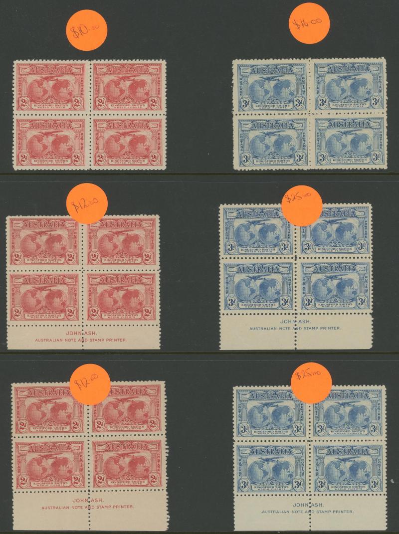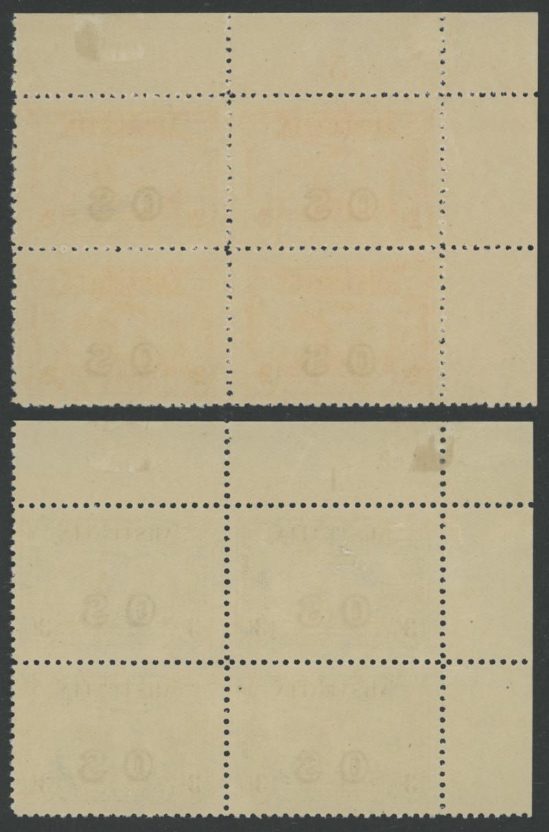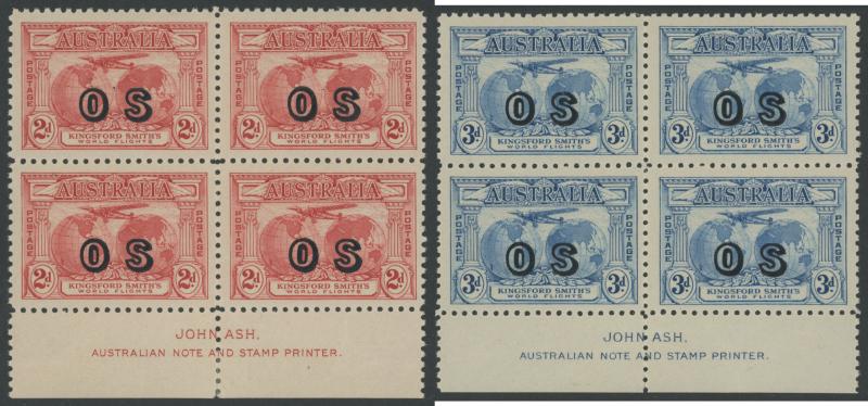 1931 Kingsford Smith 2d red & 3d blue overprinted 'OS' SG O123-4 John Ash Imprint blocks of 4 ACSC 141(OS)zh & 142(OS)zc,