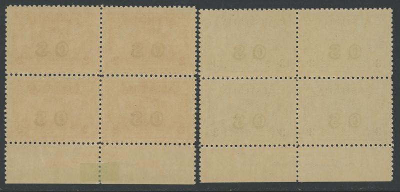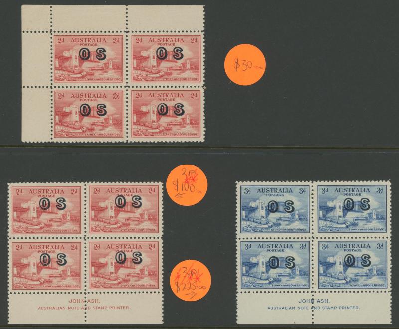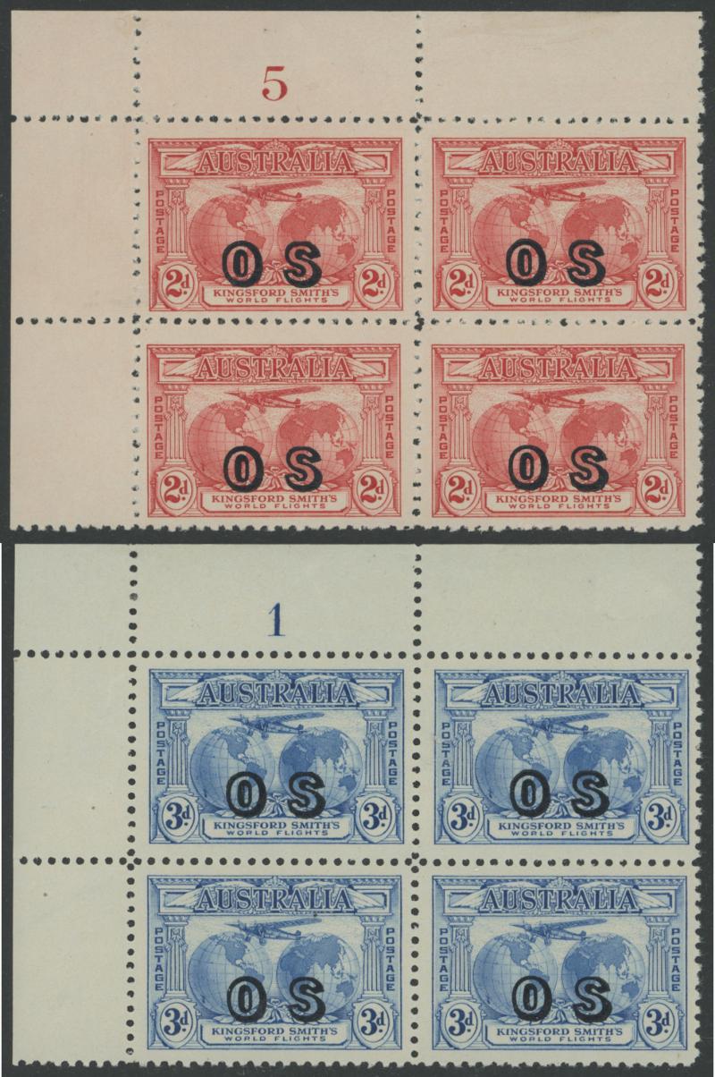 1931 Kingsford Smith overprinted 'OS' 2d red SG O123 Plate Number '5' & 3d blue SG O124 Plate Number '1' blocks of four ACSC