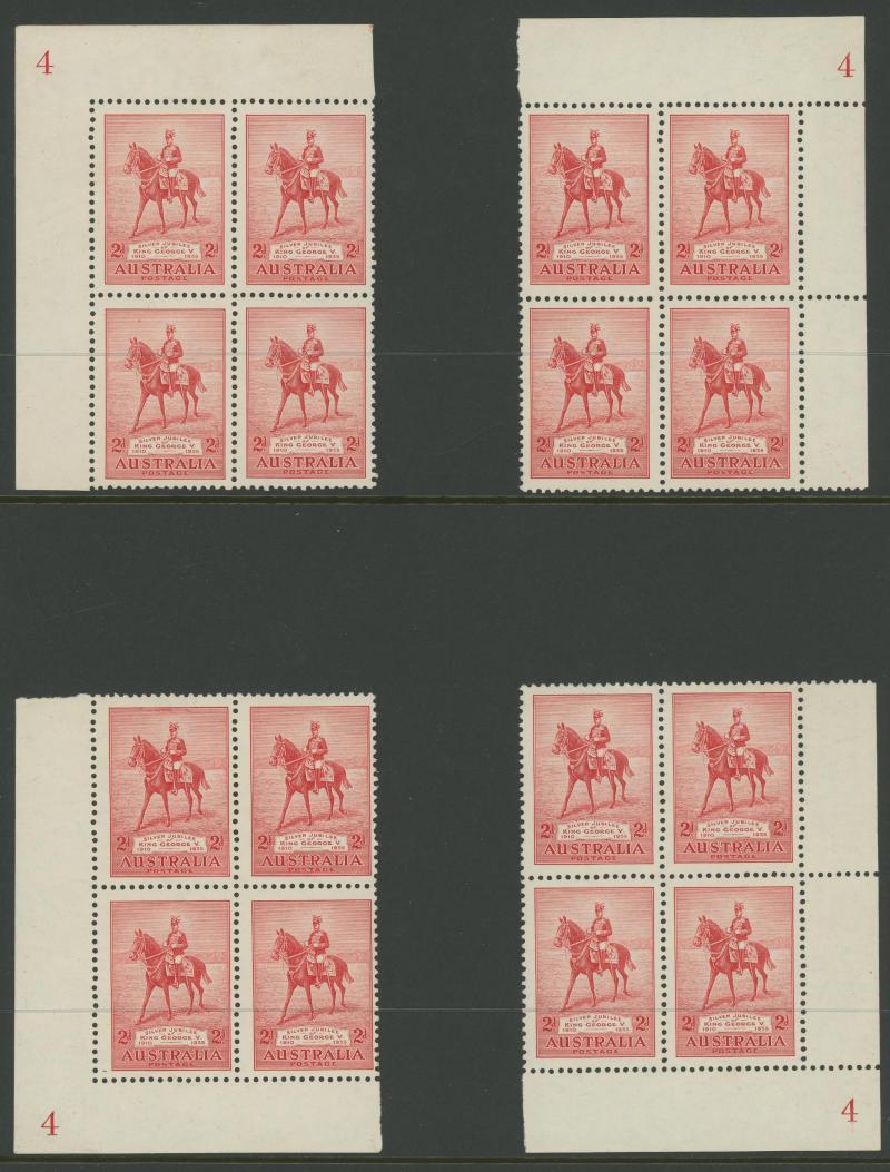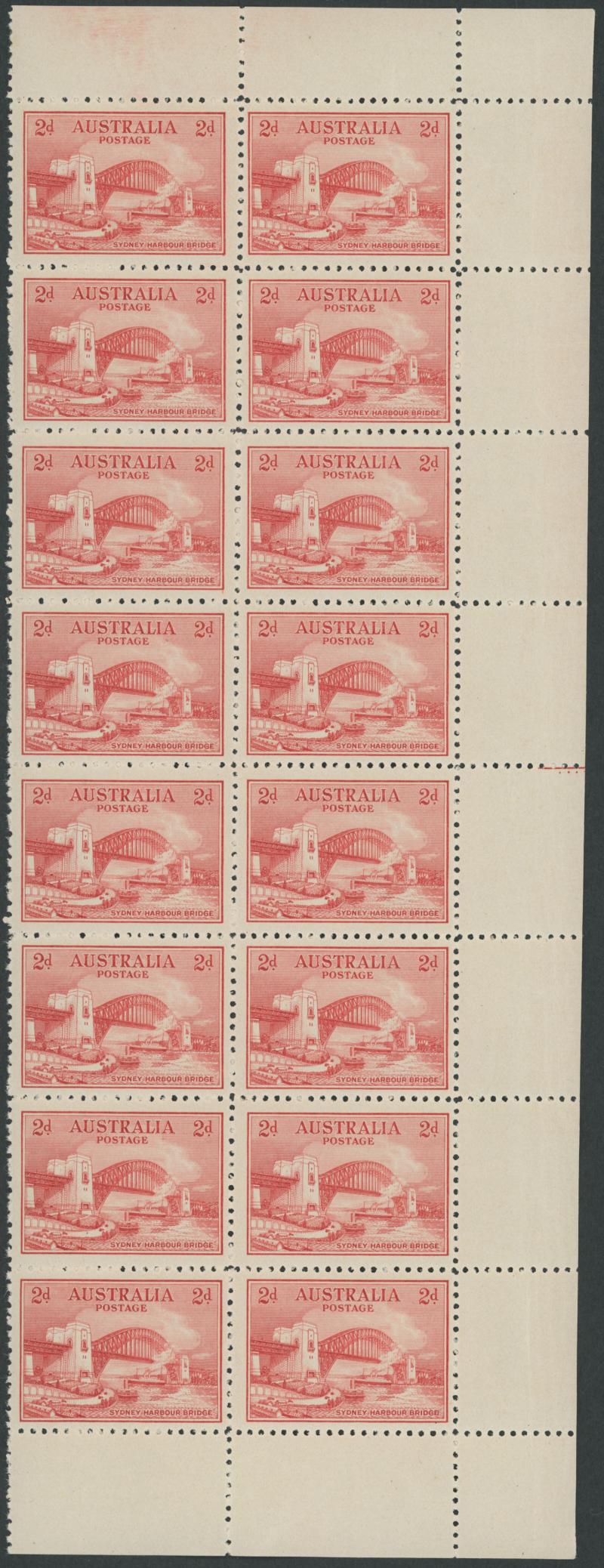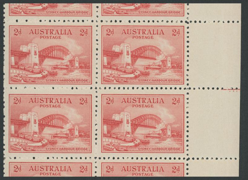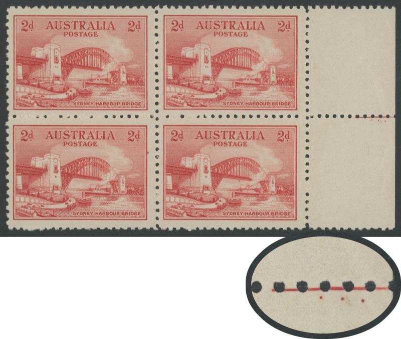 1932 Sydney Harbour Bridge 2d red marginal block of 4 from the right of the sheet with Four Plate Dots below Red Line in the margin