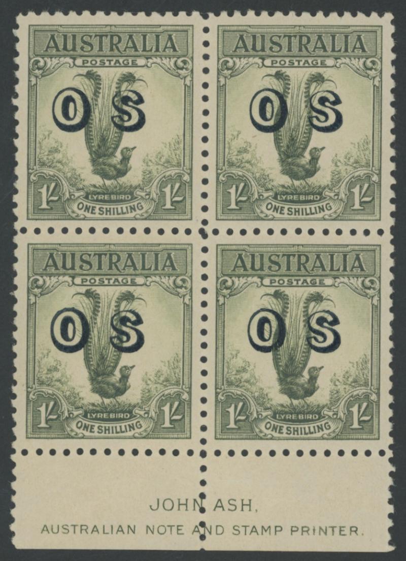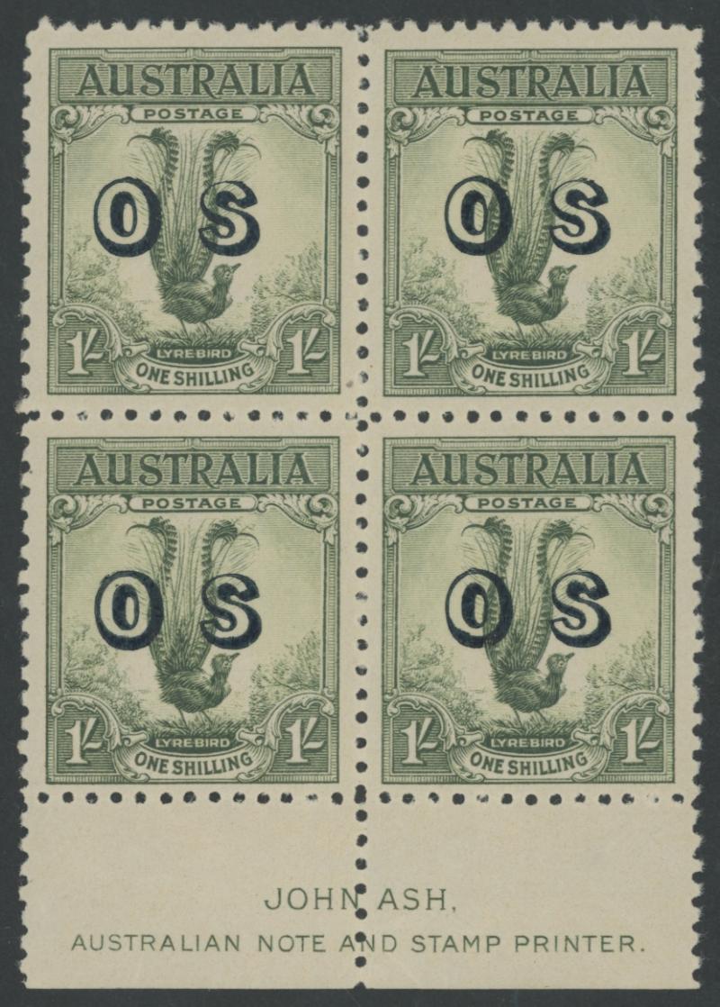 1932 Large Lyrebird 1/- green overprinted 'OS' SG O136 John Ash Imprint block of 4 ACSC 145(OS)za, well-centred, unmounted, Cat