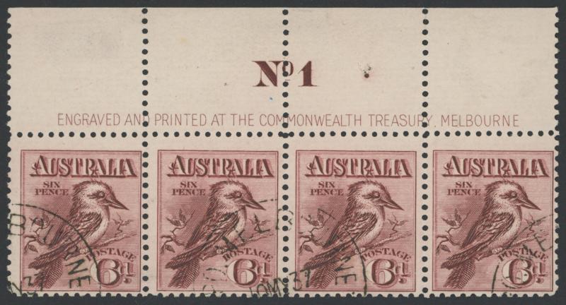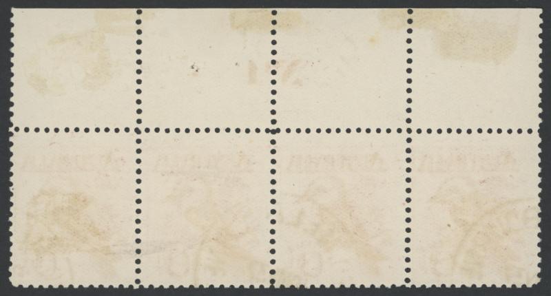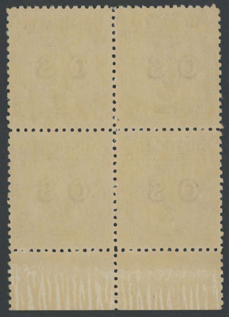 Treasury Imprint & Plate Number ACSC 60z, , CTO with 'GPO MELBOURNE/10MY37'/ [VIC-AUST]' cds, no gum, Cat $3000 for an imprint block of 8. A very scarce item. (Image1) (Image2)
