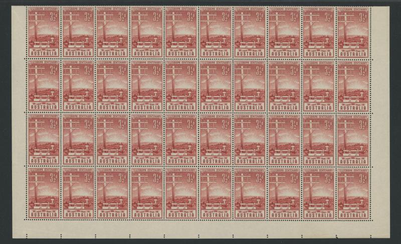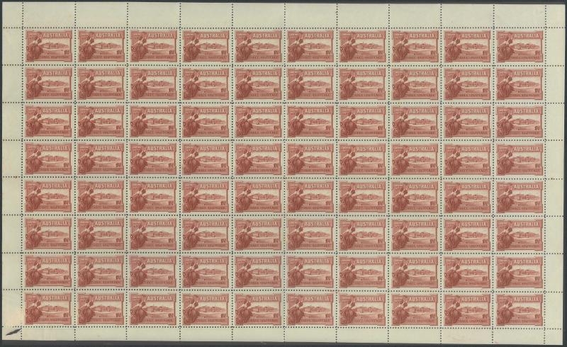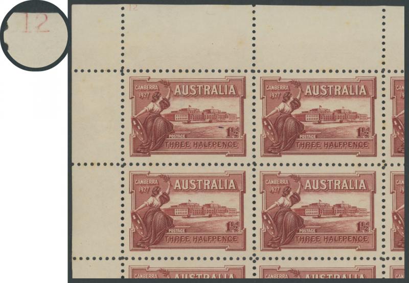 1927 Opening of Federal Parliament House Canberra 1½d lake SG 105 complete sheet of 80 (10x8) with complete Plate Number ' 12 ' at
