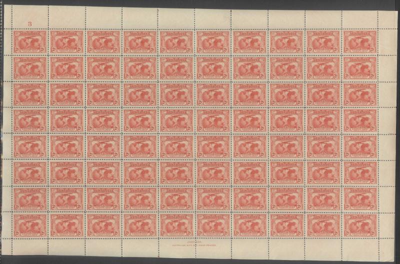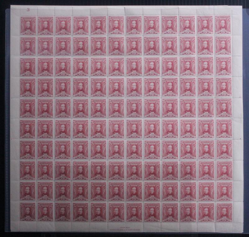 1930 Charles Sturt 1½d carmine SG 117 complete sheet of 120 (12x10) with complete Plate Number ' 3 ' at upper-left ACSC 139zb,