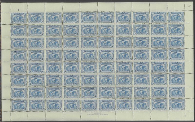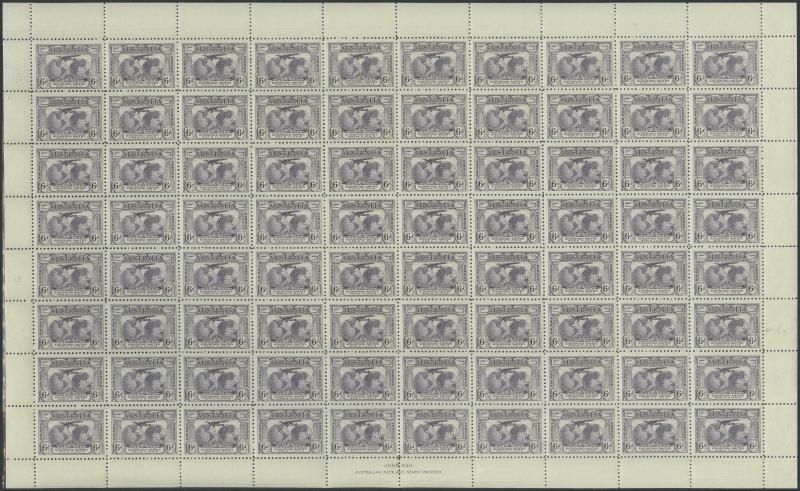 1931 Kingsford Smith 2d with Plate Number '3', 3d with Plate Number '1' and 6d SG 121-3 complete sheets of 80 (10x8) ACSC 141zb