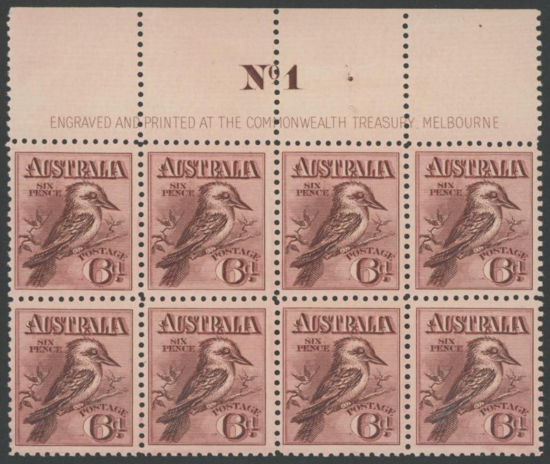 1914 Engraved Kookaburra 6d maroon SG 19 marginal block of 8 from the top of sheet with complete Plate 1 Commonwealth Treasury