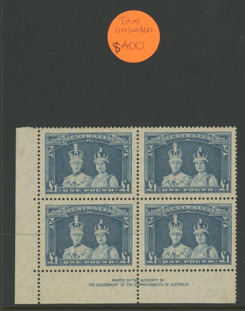 x5 (one **, two with thins in the margins), ANZAC 1/- imprint pair (**) & two blocks of 4 (*/**), KGVI 1½d brown imprint block of 24 (6x4) and 1/4d block of 36 (6x6) both with most units **, Robes imprint blocks 5/- x4, 10/- x2, £1 x2 (one toned)