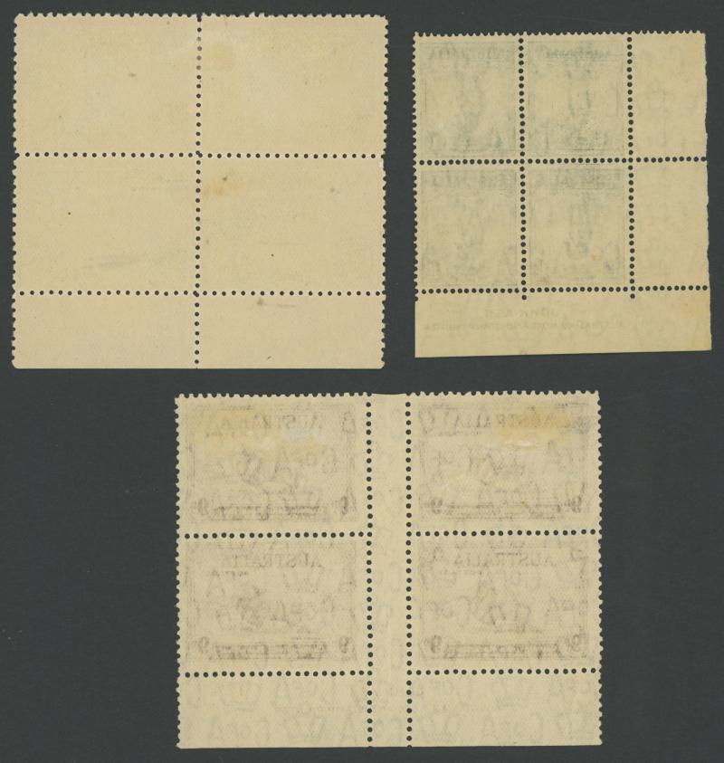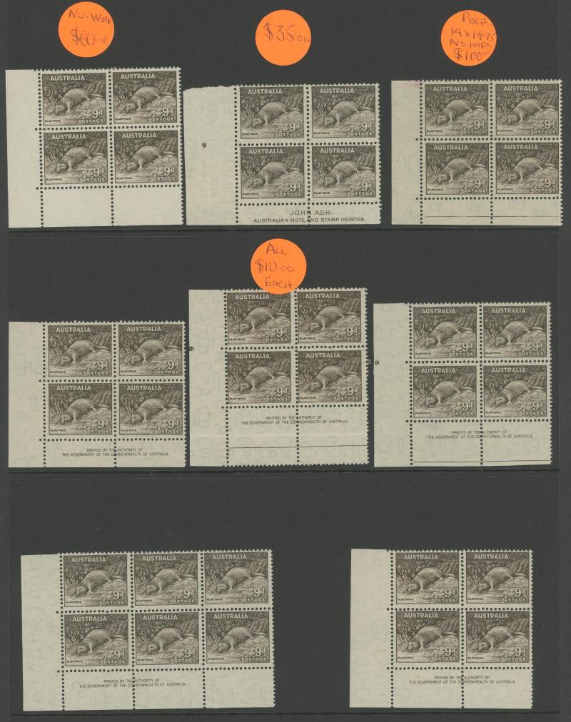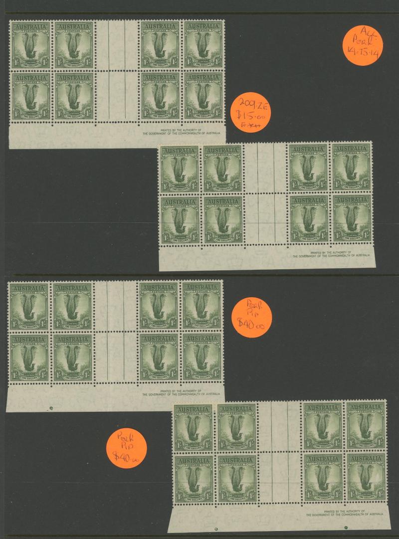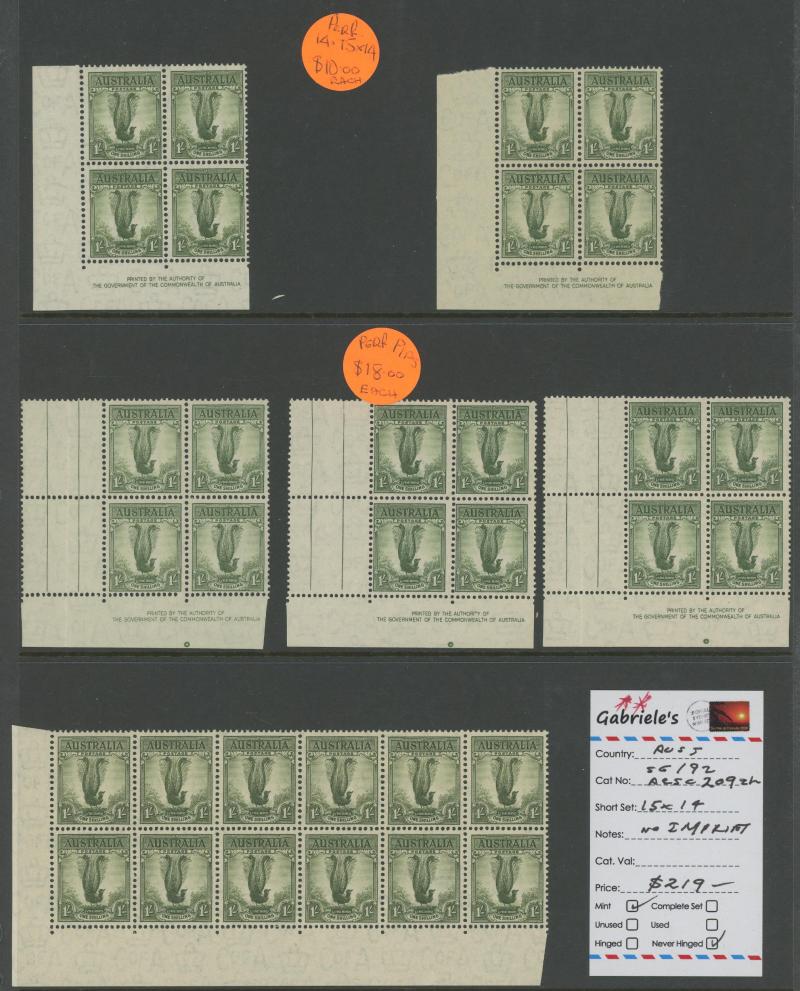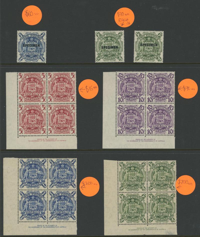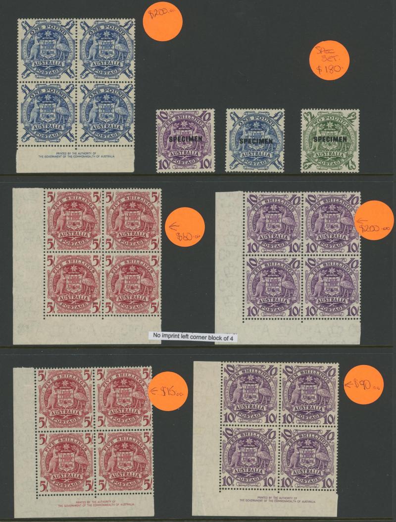 plus Thick Paper imprint pairs, AIF blocks of 4, Surcharges '3½d' on 3d & '5½d' on 5d imprint blocks of 16 or 10, Arms 10/- imprint & No Imprint plus 'SPECIMEN' set and £2 used block of 4, Aborigine 2/6d imprint x4 and No Imprint block of 8 x2, Food
